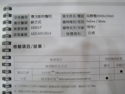 血檢的結果為血溶性的貧血,但肝腎功能是正常的,初步診斷是感染了貓血巴東體。