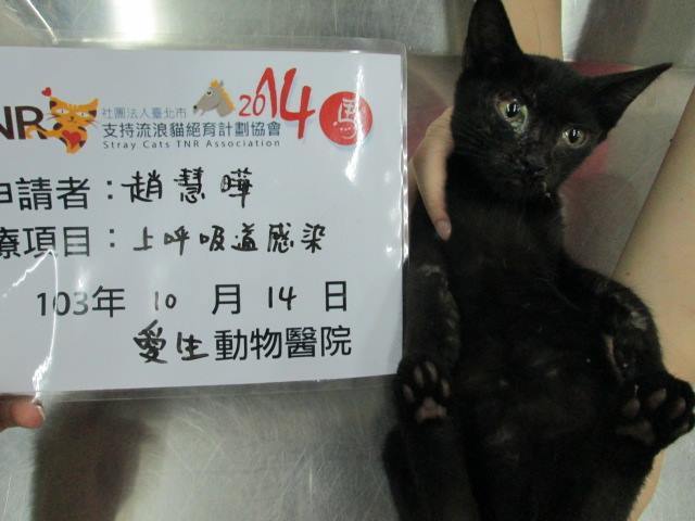 主題: T貓T到呼吸道感染的小貓 申請者姓名: 趙慧曄 花色: 申請日期: 2014-11-05 00:49:44 申請者部落格: 申請者臉書網址: 所在縣市/合作醫院: 屏東縣/愛生動物醫院 治療費用: 4000元 需求人數: 5人 已結案 (2014-11-12 11:53:37) 報名人員: rainbowstar39(已付款)、廖苑純(已付款)、SASA(已付款)、elsa(已付款)、annawu(已付款)、 候補人員: 動物病情說明: 這是屏東夜市TNR街貓時T到一隻上呼吸道感染的可憐小黑貓~~滿臉膿鼻!!如果不救他必定死在街頭!!順手撈起送醫處理!!需住院醫療!!請大家幫幫他的醫療費用!!謝謝大家的愛心幫忙喔!!謝謝!! 動物近況說明: 經過了住院醫療小黑貓已經復原的非常好!!不然後果不堪設想!!謝謝大家的愛心!!才讓他能健康的康復!!