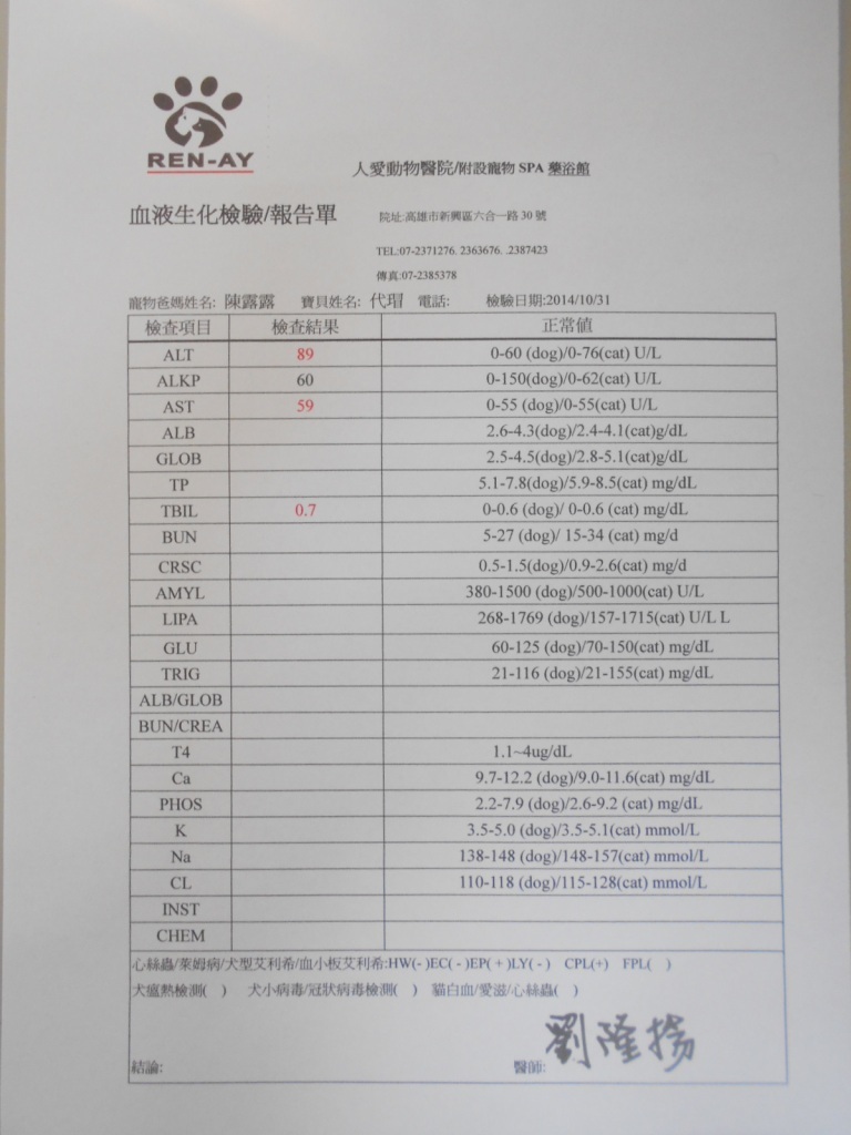 主題: 疑似誤食登革熱噴灑藥劑之瑁瑁 申請者姓名: 陳露露 花色: 申請日期: 2014-11-04 12:19:01 申請者部落格: 申請者臉書網址: https://www.facebook.com/profile.php?id=100000720481202 所在縣市/合作醫院: 高雄市/人愛動物醫院 治療費用: 8640元 需求人數: 10人 已結案 (2014-11-12 11:52:52) 報名人員: 李瓜瓜(已付款)、廖苑純(已付款)、王金一 x2(已付款)、SASA(已付款)、annawu(已付款)、Qian(已付款)、Bea(已付款)、Bonnie Liu(已付款)、Bonnie Liu(已付款)、 候補人員: 動物病情說明: 瑁瑁為志工(我)餵養區域之浪浪