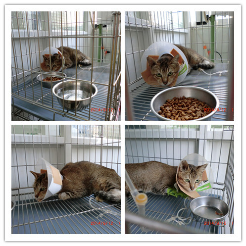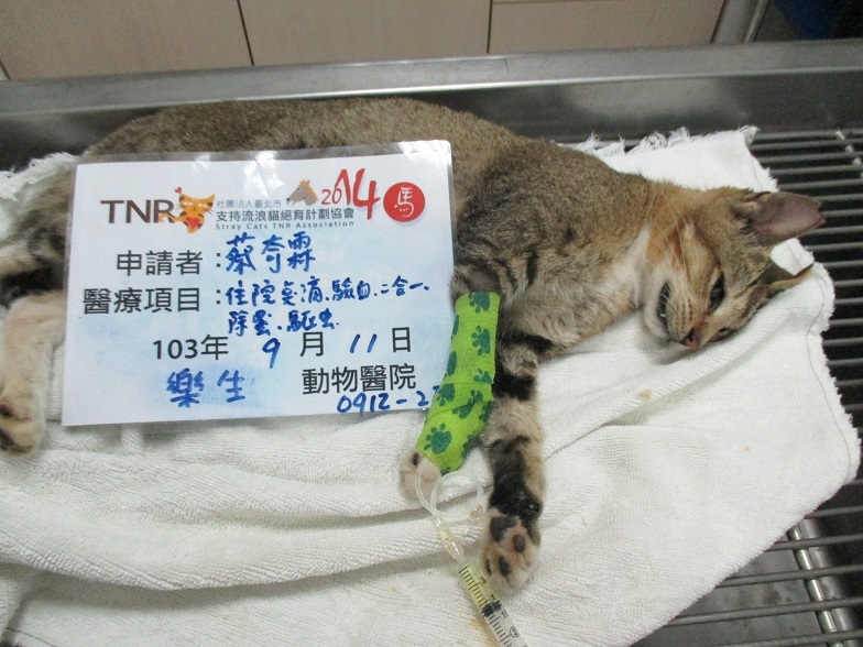 014/9/11成功誘捕,帶她去結紮,但醫生結紮時發現腹水,黃疸,建議驗血釐清病因。驗血結果為肝指數過高,貧血,白血球過高及腎指數偏高,初步診斷為肝炎+血巴東蟲症,先上點滴治療,小咪也開始她的住院生活。