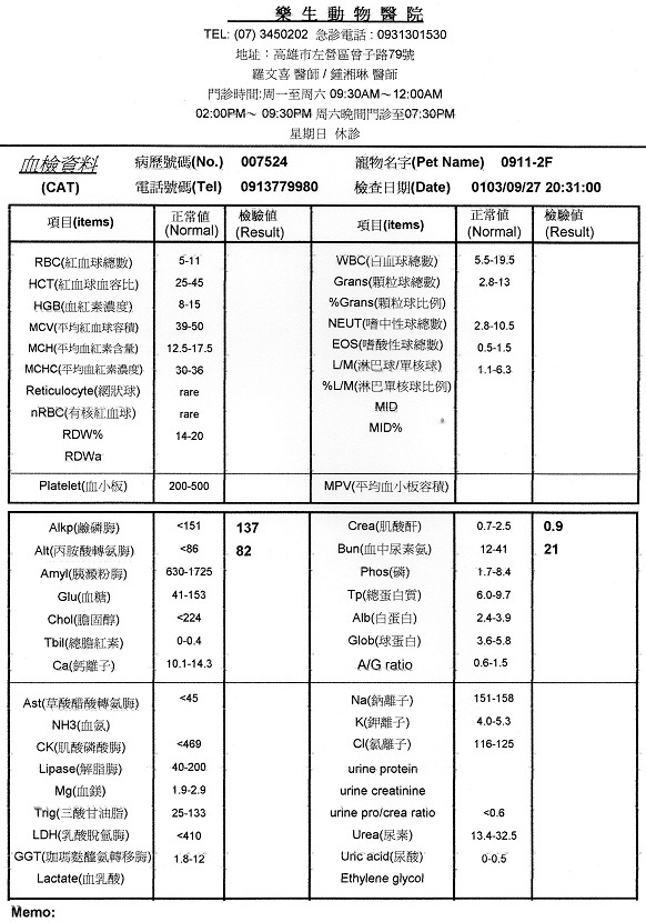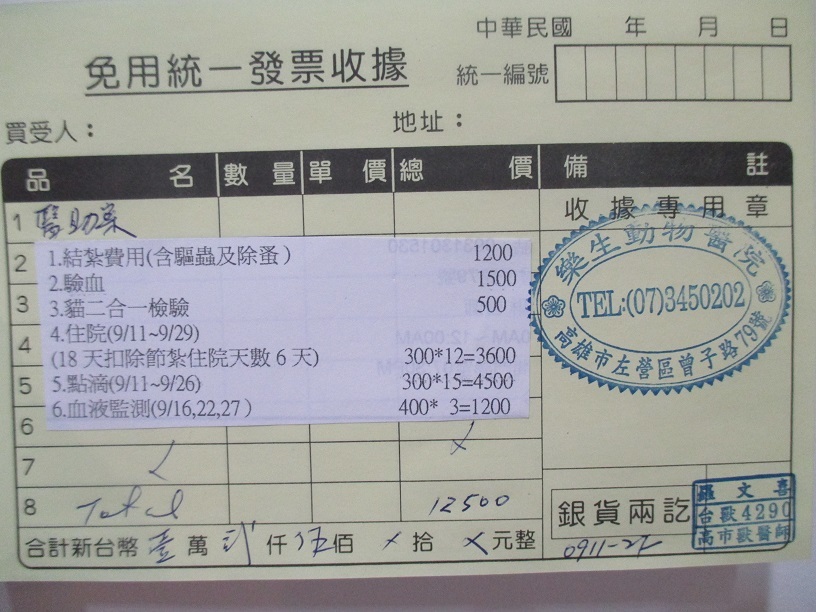 當下醫生馬上抽血檢查也順便結紮~結紮時發現有腹水及黃疸的現象,初步驗血有肝指數偏高,貧血,白血球過高及腎指數微高的現象,初步診斷為肝炎or血巴東蟲症