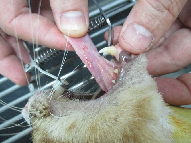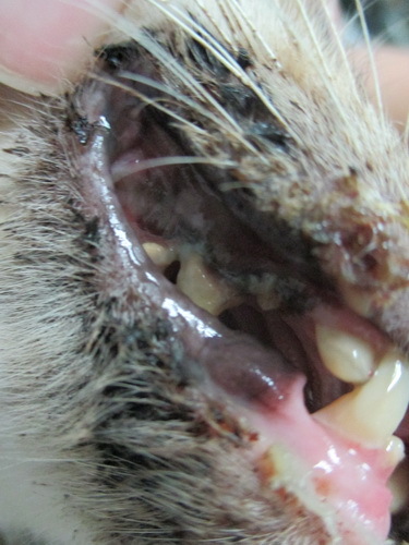 入院狀況:嚴重鼻膿及眼分泌物沾黏雙眼,流口水,下巴一直都是口水,耳朵有外傷,腹部有個類似結紮的傷口未癒合,檢驗發現是隻愛滋貓,嚴重口炎及牙結石,導致他不吃,瘦的能明顯看到他的脊椎,精神狀況很差