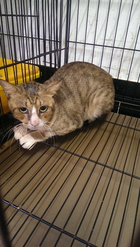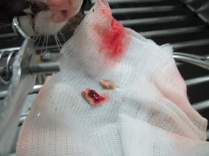 在收容所裡要抓牠進手提籠時,才發現原來牠瘦的可怕,並不像外表中的大隻,好清楚的肋骨,連脊椎也可明顯地摸到一節一節的,沒肉!下意識的直覺是牠一定有嚴重的口炎,導致牠不能吃,而這狀況應該有段時間了,沒時間了,快速的裝籠帶走。