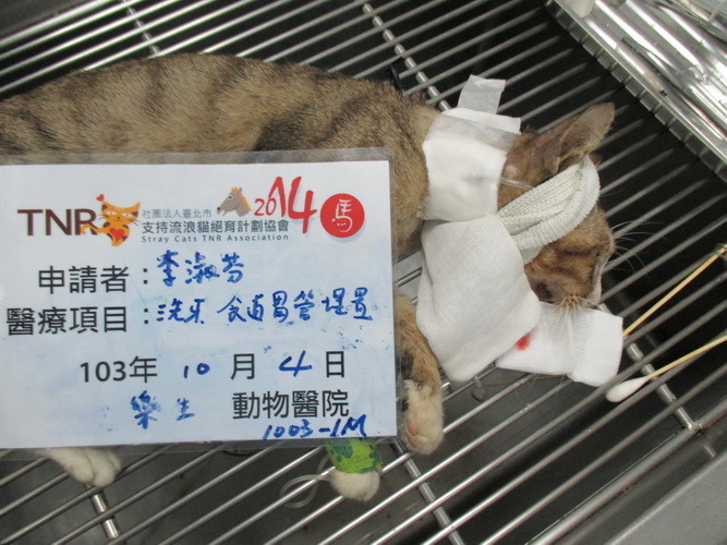 10月4日進食狀況依然不佳,幾乎不吃, 醫生告知我一定要做食道胃管埋置手術,用灌食方式強迫他進食,這時牠的體重只有2.83公斤,就成貓而言,牠真的太瘦了!