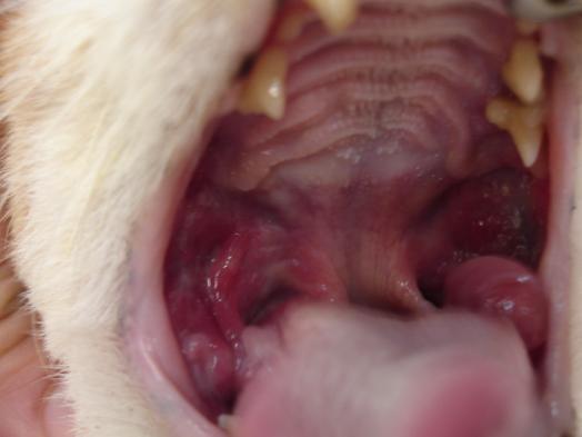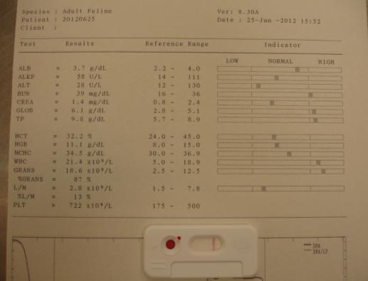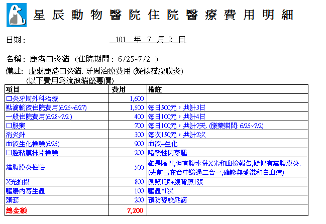經血檢和口腔粘膜抺片檢查,確診貓患有”啫酸性球增多口炎”,導致口腔發炎潰爛. 另外貓咪本身並不胖但腹部很腫大. 懷疑有腹水. 因此也拍了X光檢查. 發現2顆腎臟異常大. 雖然貓傳染性腹膜炎檢驗呈現陰性. 但是不排除此貓患有貓傳染性腹膜炎. 目前不針對此問題醫治. 只要貓咪抵抗力夠不發病, 並不會影響貓咪的生活.