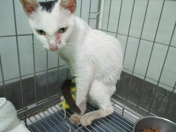 照片3是手術前 照片6是手術後動物近況說明: 小黑帽18號回家,還蠻緊張的,沒有像在醫院那麼穩定,會哈氣,19號有穩定些,慢動作的接近他,就不會呼我了,我有用浴巾包住抱著她幫他測了體重是1.8公斤,目前以皇家幼貓當主食,然後每天會再加一餐【貝克牛磺酸錠磨成粉+THOMAS LABS 湯瑪士離氨酸 拌日本AIXIA《MiawMiaw》金妙喵(肽添加-肉狀餐罐)給他吃,所以他目前會吃到4餐,他目前的食慾都很好,喝水量都有超過150CC,他身上黴菌的部分已有好轉35%,想說等她再胖一點,皮膚狀況好一些再進行送養部分,我有在自己的臉書上寫他的一些生活狀況,請朋友分享讓認養進度可以快一點
