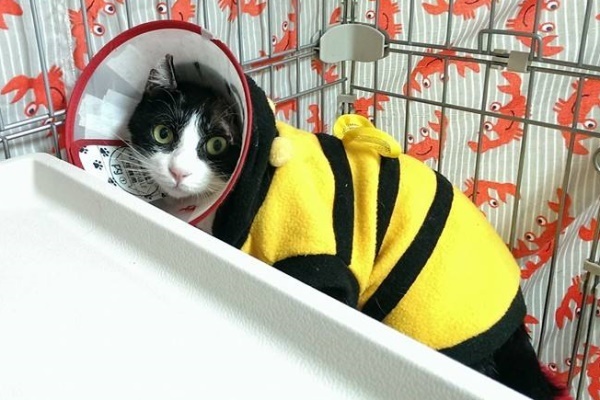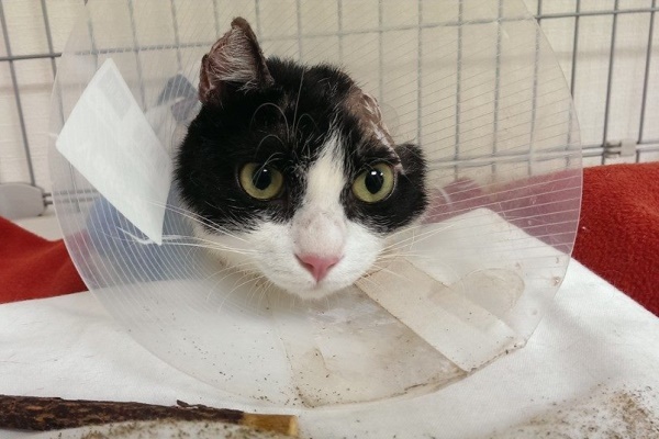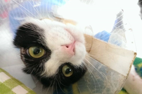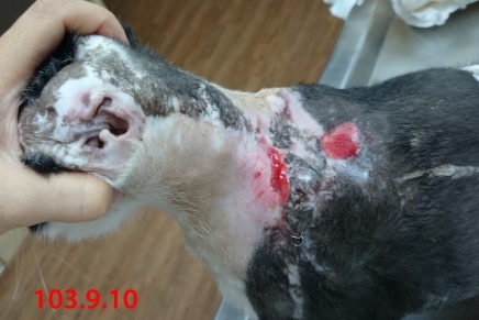 貓貓因燒傷跑來家裡求救,立即送往醫院,醫生研判應該是遭人惡意潑油放火,左耳已完全燒爛,沿著頸部到上背部有四級燒傷,醫院說這需要長期的治療,至少兩周的時間幫助牠將組織長好,至少需要1個月以上才能完全復原,且復原後需要重建左耳,目前醫藥費用是個未知數。