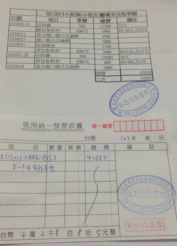 主題: 大面積燙傷的小朋友第最後階段醫療費用(內有血腥照..慎入) 申請者姓名: 臺北市支持流浪貓絕育計劃協會 花色: 申請日期: 2014-10-28 13:20:08 申請者部落格: 申請者臉書網址: 所在縣市/合作醫院: 台北市/沐恩動物醫院 治療費用: 42885元 需求人數: 46人 已結案 (2015-02-24 12:20:37) 報名人員: 微光(已付款)、Becca Huang(已付款)、gill(已付款)、Rita、imsa(已付款)、irenesmile(已付款)、小粒沙(已付款)、sowa(已付款)、Jean Yang、FiFi(已付款)、KATE(已付款)、Yulan Ni(已付款)、Chen Hsien Hsien(已付款)、Prince Chen(已付款)、Chen Hsien Hsien、陳吉咪 x2(已付款)、Pei-yan Wu(已付款)、Winnie(已付款)、鍾天寧、鍾天寧、Kaya Lee(已付款)、Tinas x2(已付款)、Yu Ju Lin(已付款)、Michelle Yuyuan(已付款)、小涵(已付款)、Ou Han x2(已付款)、A Ya Chang(已付款)、BigMao(已付款)、Hsin-Ju Chiang(已付款)、mudd(已付款)、方鳳嬌(已付款)、Marina Peng(已付款)、巴士噗噗(已付款)、蔡鳳梨(已付款)、Witty Wu(已付款)、942cat2(已付款)、Gina Lu(已付款)、Erin Yu(已付款)、Dee Liu(已付款)、黃佳琳(已付款)、Joyce Nien(已付款)、Tai Tai Yang、王可樂的日語教室(已付款)、法王、Wendy、潔莎(已付款)、beforn(已付款)、Ru(已付款)、Huimin Liu(已付款)、戴富家(已付款)、Yiman Chou(已付款)、 候補人員: Prince Chen、 動物病情說明: << 小朋友 >>