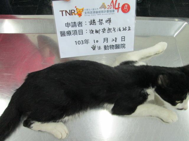 主題: T貓T到後肢無法站立的貓 申請者姓名: 趙慧曄 花色: 申請日期: 2014-12-02 16:39:47 申請者部落格: 申請者臉書網址: 所在縣市/合作醫院: 屏東縣/愛生動物醫院 治療費用: 5200元 需求人數: 7人 已結案 (2015-02-24 13:09:27) 報名人員: nioniochou(已付款)、Rocky Chen x2(已付款)、meg19791219 x2(已付款)、Misu Sweet(已付款)、Misu Sweet(已付款)、曹小文(已付款)、曹小文(已付款)、 候補人員: 動物病情說明: 這是屏東勝利市場青島街延伸的國宅區域!!有愛媽餵食!!但結紮觀念不好~經由志工溝通!!一一誘捕TNR!!今天在誘捕貓咪時發現之前T過的貓咪後腳划行不穩的走....這是什麼狀況趕緊誘捕送醫!!照X光片檢查骨頭無異樣!!醫生朝神經方面醫療中!!希望大家能幫幫他的醫療費用!!謝謝~~ 動物近況說明: 經由醫師投藥醫療~~還是無法站立!!志工接回針灸治療看看有沒有奇蹟出現!!謝謝大家的愛心!!不會讓行動不便他流露街頭....謝謝大家的愛心!!