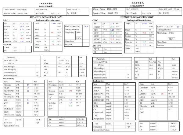 主題: 血便發燒的噴噴 申請者姓名: 臺北市支持流浪貓絕育計劃協會 花色: 申請日期: 2014-10-31 15:35:45 申請者部落格: 申請者臉書網址: 所在縣市/合作醫院: 台北市/極光動物醫院 治療費用: 9890元 需求人數: 22人 已結案 (2014-11-12 11:38:04) 報名人員: 劉文玲(已付款)、Shizuka Ho(已付款)、Yun Lin(已付款)、戴戴(已付款)、ERic YU x2(已付款)、evelyn.lin66(已付款)、徐大寶(已付款)、MiSty Fang(已付款)、愛芹 x2(已付款)、Ching Tseng x11(已付款)、 候補人員: 動物病情說明: 噴噴一隻被黏膠黏到呆坐在路邊的棄貓,脫水營養不良肝指數過高很虛弱,被志工發現帶至醫院治療,出院後安置於協會安養之家照顧,等養胖預計要結紮送養,9/8早上噴噴吃了一點罐頭,突然居烈嘔吐甚至還吐血,緊急送往醫院檢查,血檢數值正常,精神較差,觀察發現淋巴有ㄧ小粒禿出物,採樣檢驗,所幸並非惡性,只需追蹤即可,先住院給予制酸劑減緩噁心反胃的狀況,精神食慾慢慢改善,但還沒有完全恢復,醫師擔心是否是慢性胃炎或者食道炎,若治療一周不見改善可能要進行內視鏡檢查,住院第六天,噴噴突然劇烈嘔吐,吐出...15公分長的巨大毛球,開始慢慢就恢復食慾,出院每天餵食化毛膏持續觀察精神食慾,噴噴有摺耳貓的遺傳疾病,尾巴無法完全抬起,只能碰觸頭和臉,摸到下半身會不舒服哈氣,身體還沒完全恢復,尚需時間調養才能進行結紮...