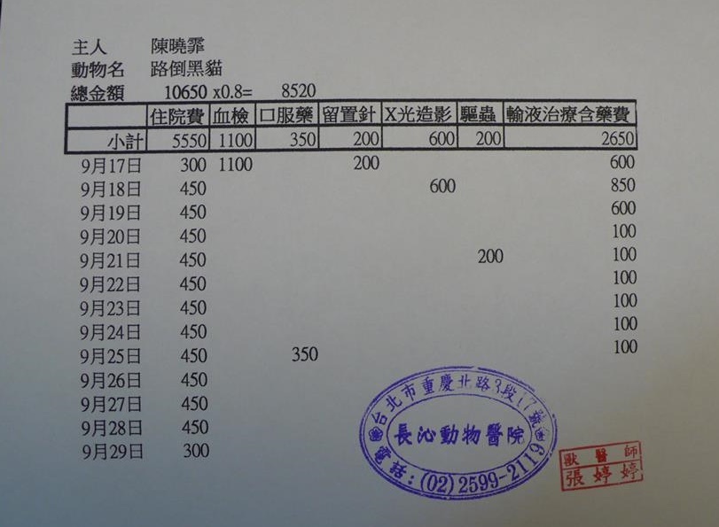 主題: 營養不良路倒小黑貓 申請者姓名: 陳曉霏 花色: 申請日期: 2015-01-14 11:42:06 申請者部落格: 申請者臉書網址: 所在縣市/合作醫院: 台北市/長沁動物醫院 治療費用: 8520元 需求人數: 10人 已結案 (2015-02-24 12:15:35) 報名人員: Irene Hsu x2(已付款)、ruei(已付款)、林科(已付款)、Emily Yen(已付款)、Yang Hsu(已付款)、ERic YU(已付款)、ztsai(已付款)、徐阿悟(已付款)、徐阿悟、郭瑞希(已付款)、 候補人員: 動物病情說明: 是一個下雨的晚上