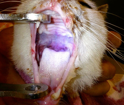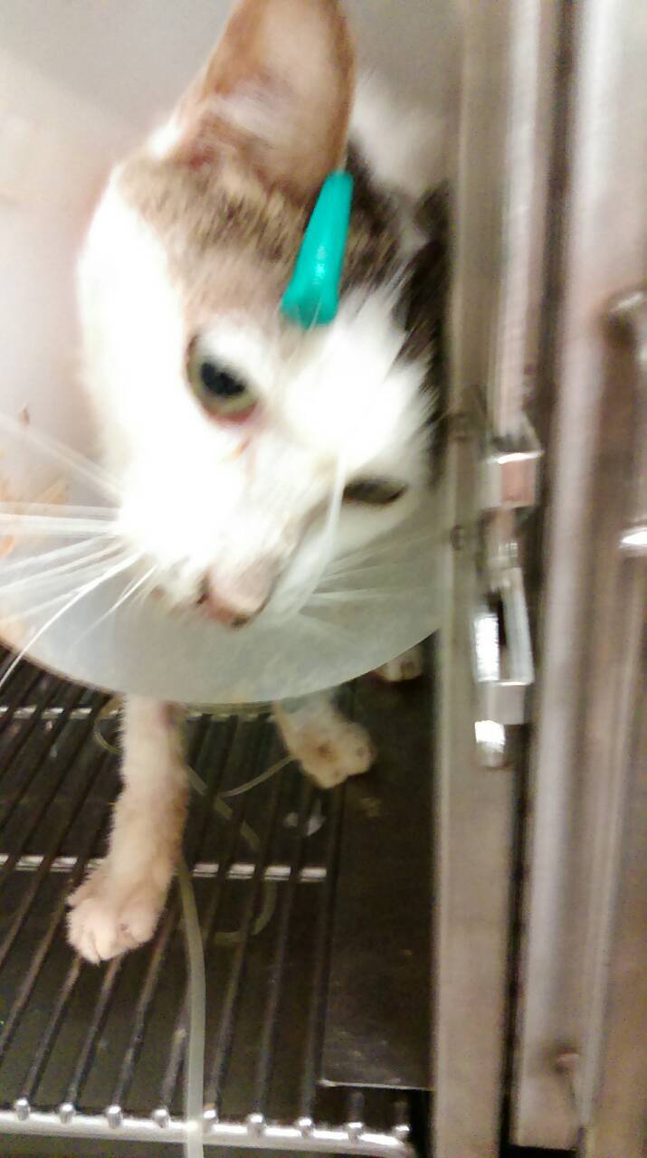 10/30早上送進醫院,醫生幫牠作了血檢,發現牠有嚴重的腎衰竭和愛滋口炎,因為腎衰竭的關係只能用專用的抗生素泰寧,血檢的alb太低加打白蛋白,而口炎嚴重無法進食又太虛弱,10/31醫生幫牛牛插上鼻胃管罐食,希望能挽救牠垂危的生命。
