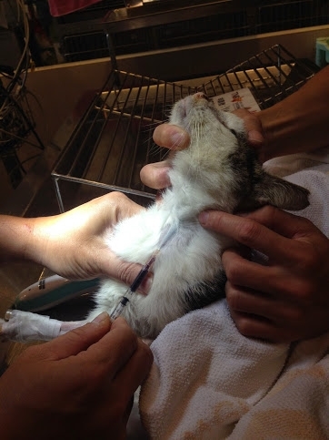11/14 經檢查牛牛因貧血黏膜蒼白,股動脈摸不到,呼吸窘迫,血壓量過 收縮壓55,凝血異常,有敗血症,醫生通知必須緊急輸血來捥救垂危的生命,我趕緊拜託我的認養人請他們帶貓來醫院作血液配對,結果有找到,也完成輸血。