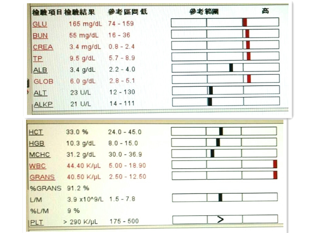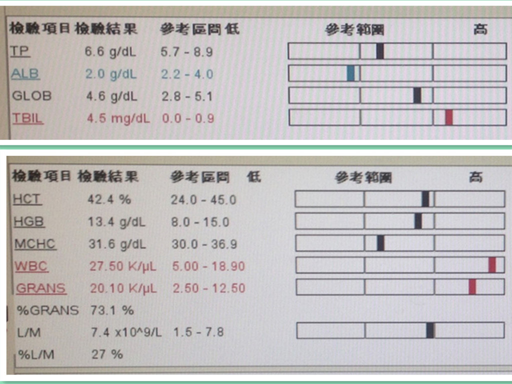 血液檢查結果:白血球及嗜中性球過高,因愛滋病免疫系統下降有敗血症現象,量血壓亦低於70,所以緊急打強心點滴維持血壓 。尿毒指數高於125 可能有併發症危險,所以打沒有腎毒性抗生素泰寧,血檢中的phos11.2 血磷過高,灌食補充液中,需每餐加入雷西磷,減少磷的吸收。LAC>12 乳酸超高,使用無乳酸點滴。