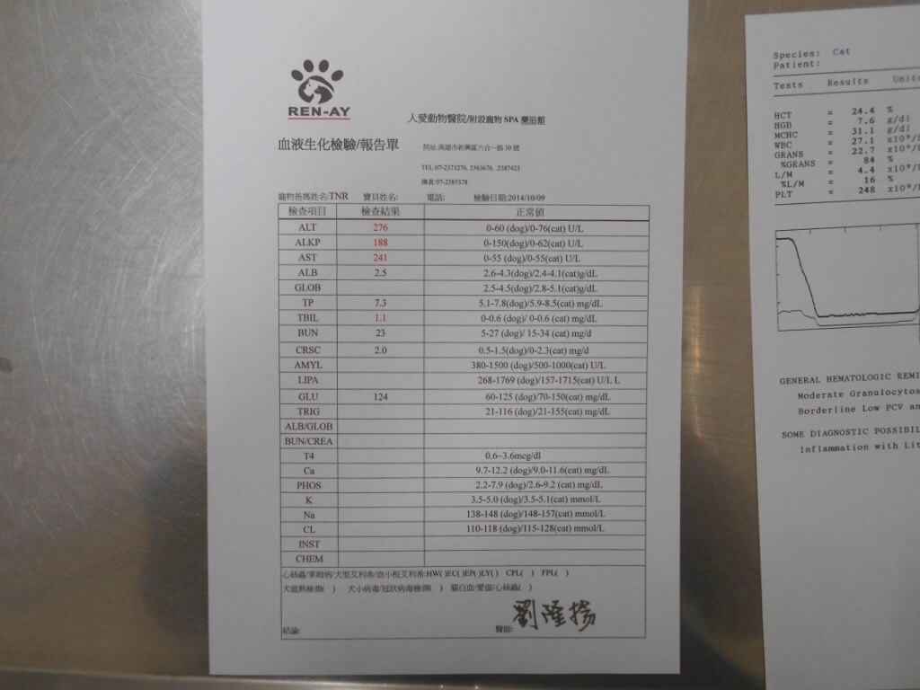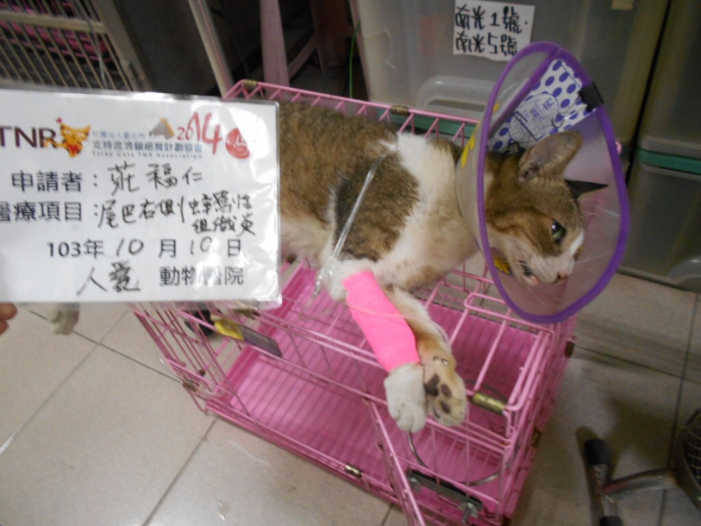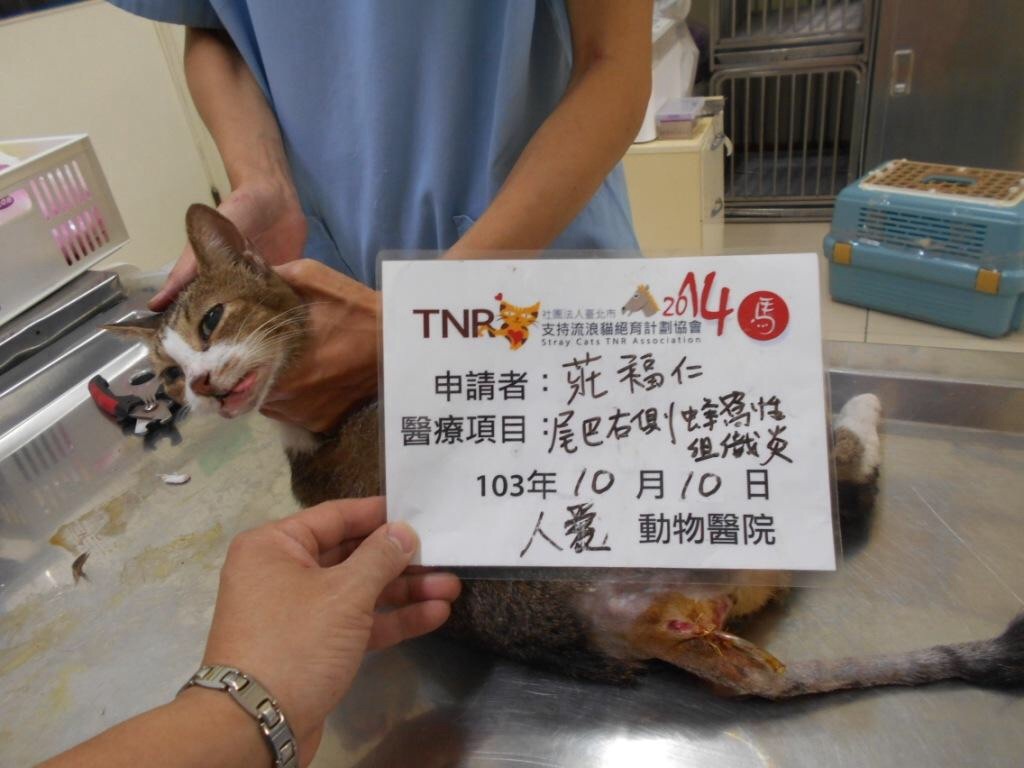 主題: 虎斑尾巴頭端3cm蜂窩性組織炎 併肝腫大指數上升 貧血 食慾差 申請者姓名: 莊福仁 花色: 申請日期: 2014-11-13 15:35:49 申請者部落格: 申請者臉書網址: 所在縣市/合作醫院: 高雄市/人愛動物醫院 治療費用: 7650元 需求人數: 9人 已結案 (2015-02-24 12:11:39) 報名人員: 陳永達(已付款)、Roy Chen(已付款)、Kate Chiu(已付款)、邱于玥(已付款)、lavinia x3(已付款)、吳毓軒(已付款)、Cary(已付款)、 候補人員: 動物病情說明: 這隻ㄋㄞㄟ 是隻結紮很多年的母貓,在那區生活近七八年,最近餵食時發現她食慾越來越差,行動緩慢,精神不振的,頭先以為是天氣熱 不想吃,後來持續多日 換了罐頭仍然不太吃,今天看到尾巴部分時發現有一個深洞,不斷有帶膿水的液體流出,及臭味傳出,便立即撈起送醫。醫生檢查發現尾巴頭端右側有一個約3cm大之蜂窩