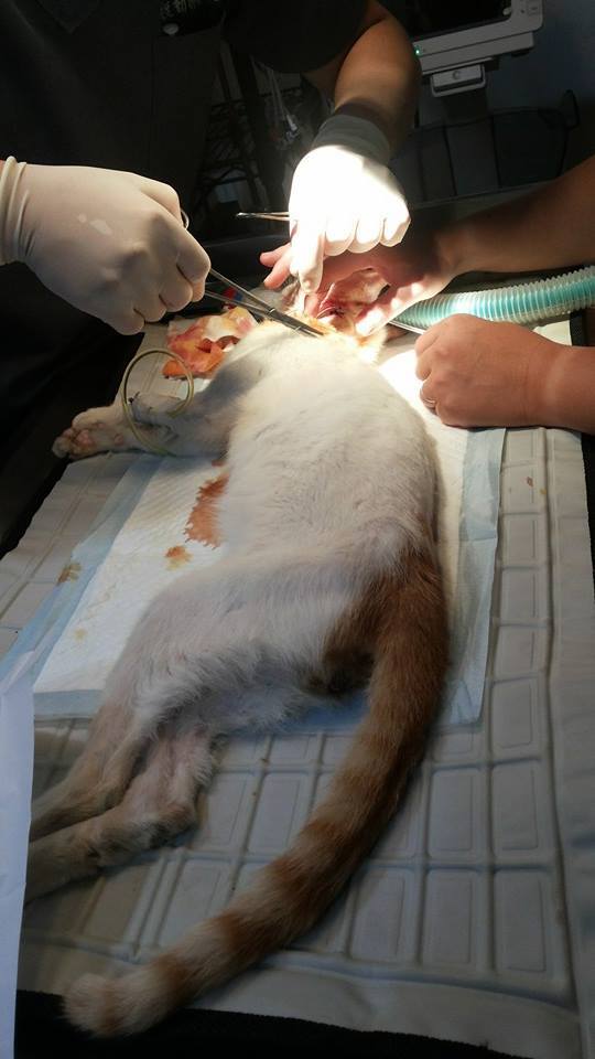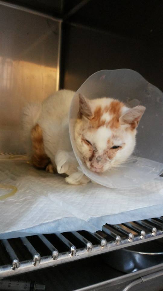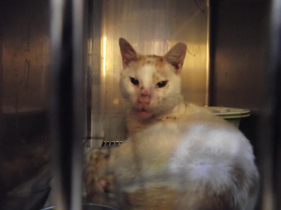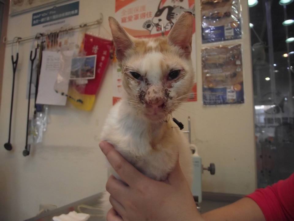 過了幾天牠終於出現了,但是不僅不吃罐頭還滿臉的眼淚和鼻涕而且變的非常的瘦,趕快先抓了送醫院緊急處理後又吊了點滴,隔天驗血結果是牠還有愛滋和白血病又合併嚴重感冒,而且太多天沒吃東西了,牠的情況很糟糕,身體很虛弱,根本無法進食了。醫生趕緊幫牠裝了食道灌食管並且每天必需幫牠灌食多次。