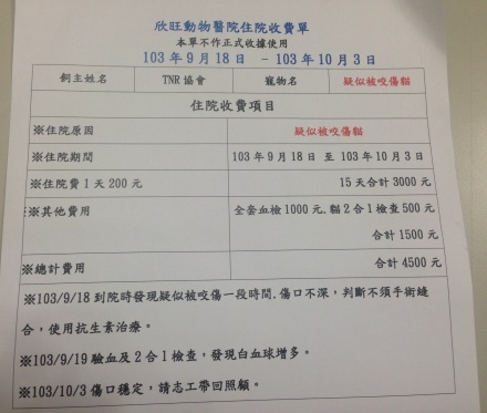主題: 被咬傷的月富貴 申請者姓名: 臺北市支持流浪貓絕育計劃協會 花色: 申請日期: 2014-11-27 11:53:24 申請者部落格: 申請者臉書網址: 所在縣市/合作醫院: 台北市/欣旺動物醫院 治療費用: 4500元 需求人數: 11人 已結案 (2015-02-24 12:02:10) 報名人員: Amber Chung x2(已付款)、lunacyryu(已付款)、Wei-Min Huang x2(已付款)、阿胖(已付款)、Fruitbo Hu x2(已付款)、黃貓咪(已付款)、Shiqin Huang(已付款)、Ivy Chen(已付款)、 候補人員: 動物病情說明: tnr捕捉的黑白色母貓,每天都會等愛心媽媽放飯,某天愛媽發現他精神狀況不好懶洋洋的,拿了他最愛吃的魚剝成絲給他也是愛吃不吃,覺得可能是不舒服,接連兩天貓都有出現等飯,但胃口都很差,愛媽非常擔心,連哄帶騙花了一個多小時才抓到,發現貓的腋下糜爛化膿發紅,送醫後幾個人幫忙用洗衣袋保定、戴頭套檢查傷口、抽血檢查,無愛滋白血、但白血球三萬五有感染的狀況,怪不得不肯吃東西,傷口清創、每天施打抗生素和促進食慾的藥物,住院15天後傷口癒合狀況穩定,出院R回由愛媽繼續餵食照顧。