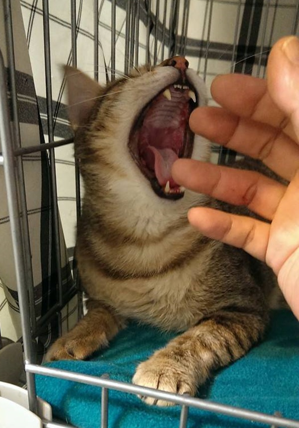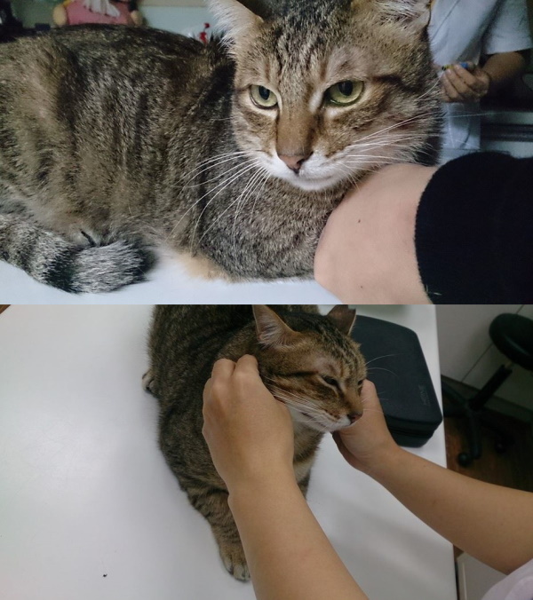 剛抓回的橡皮擦非常緊張,也很兇,但是幾天後他開始會喵喵叫的討吃,再幾天後他開始撒嬌討摸摸,甚至還會朓到醫院其中一個助理身上要抱抱。