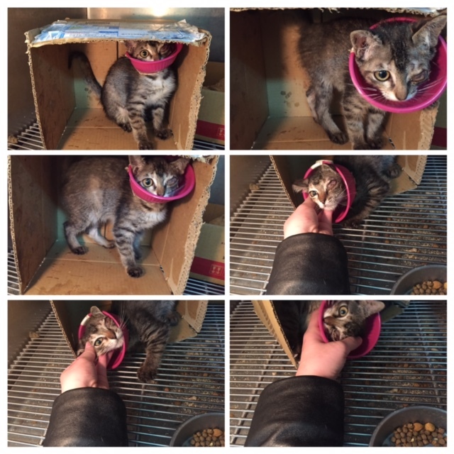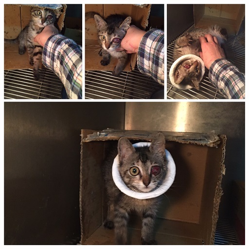 1/5:這天看到小貓時大吃一驚,原本已經不突出的眼球感覺又跑出來的樣子,醫生說應該有去磨紙箱的角角,使得角膜紅腫發炎,又把眼球給擠出去的感覺