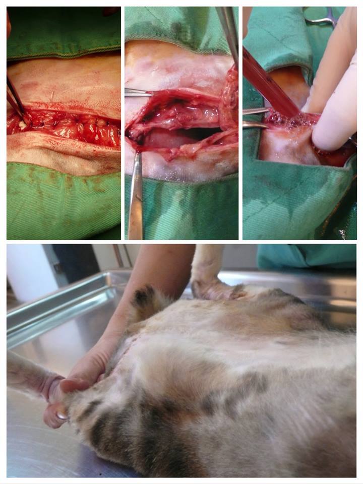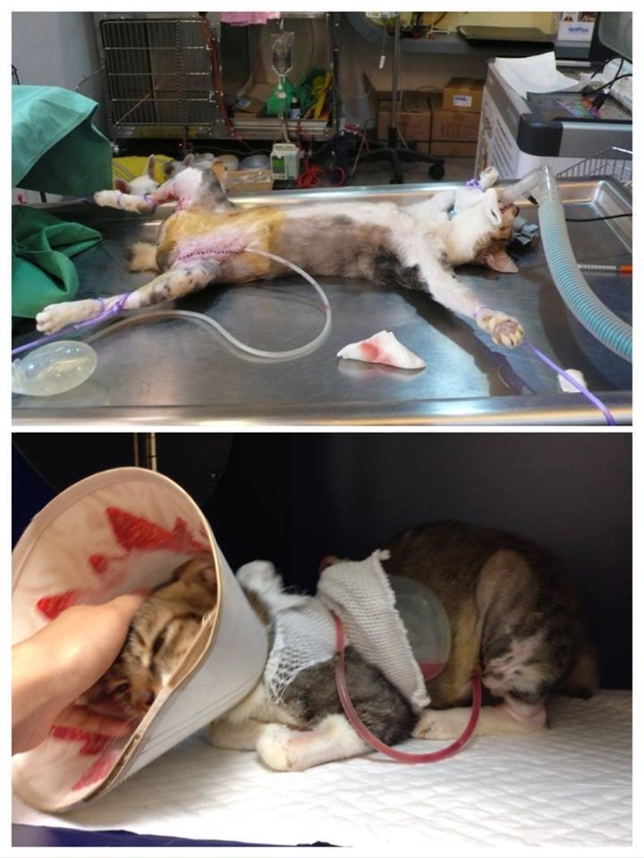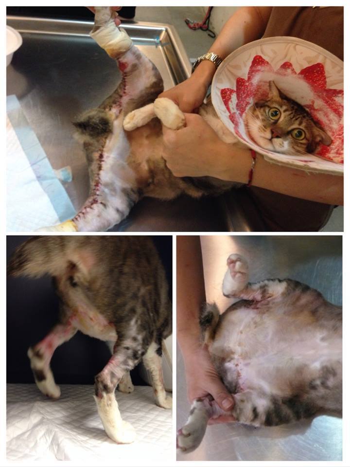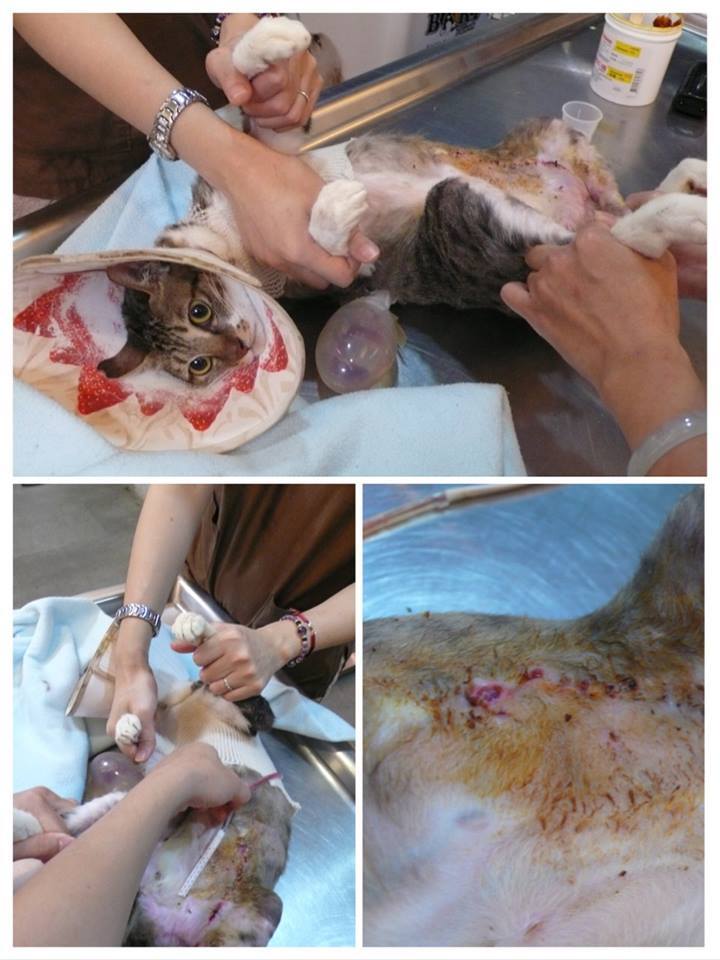 傷口面積很大,四肢,尾巴,尤其下腹部。醫生開藥,教我如何照顧傷口。很吃力但當時我也不知道有什麼其他方法。