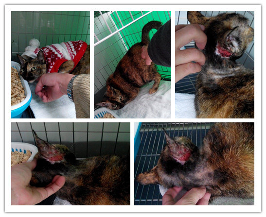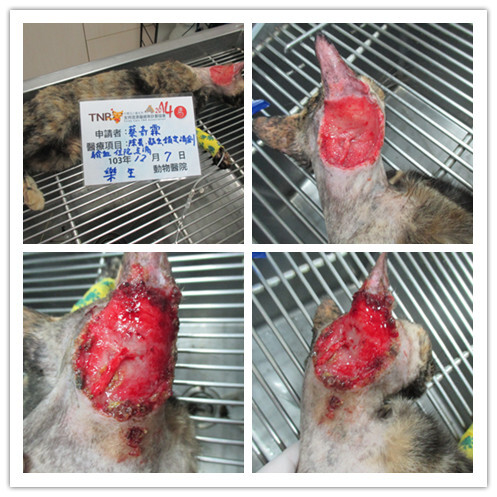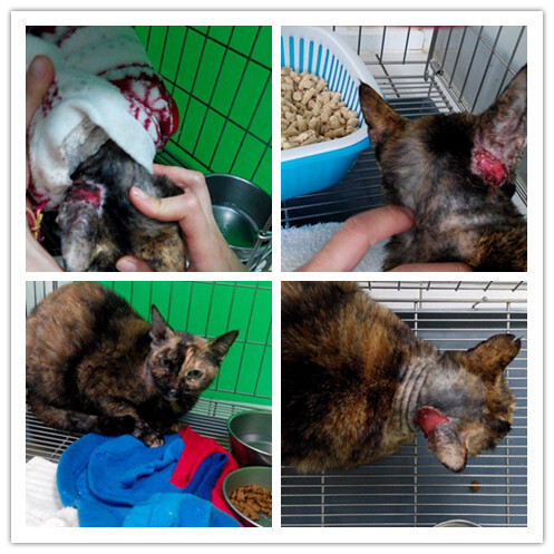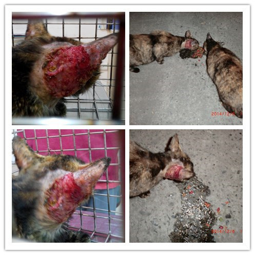 這隻玳瑁貓是我餵養區的其中一區~~光是這區玳瑁就4~5隻有~~這隻玳瑁平常不常出現~不然就是躲遠遠的~~這次不知道怎麼了忽然來灑嬌~才忽然發現到耳後一大片傷口~我想玳瑁是想讓我知道他受傷了~~趕緊回家拿籠子帶去醫院~~因為又碰到假ㄖ~~趕緊打電話聯絡醫生~~醫生一聽到貓咪狀況~~願意假日為了這隻受傷的貓咪開門等我把貓咪送到醫院~~