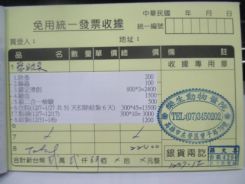 過去看玳瑁跟醫生討論~~剛好是玳瑁結紮當天~~因為照超音波都沒懷孕~~肚子卻很大顆~~而且摸起來硬硬的~~雖然食慾很好∼但醫生還是會擔心會有其他狀況∼所以在12/31當天開始禁食~~預訂晚上進行結紮手術~順便檢查是否有異樣~~