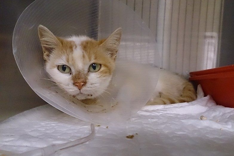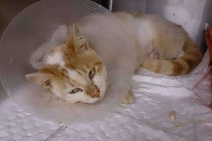 可憐的仙仙(寶貝)10/13送醫檢查,白血球七萬九千九有嚴重感染、腎衰竭、貧血體重也只有2.17公斤,很瘦弱緊急上點滴給予輸液和抗生素治療,保定全程氣麻進行傷口清創,除了頭上有橡皮筋外脖子上也一個,剃開臉上的毛,左臉頰有穿孔的大洞,舌頭潰瘍,狀況十分糟糕,住院期間仙仙寶貝越來越親近人都可以讓醫師摸摸,清理傷口,他也很努力的吃東西,但因為營養狀況不好,還需要長時間調養,腎指數也要持續監控