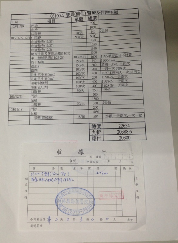 仙仙出院後已先帶回安養之家照顧,其中多次回診追蹤腎臟指數,因口炎牙齦紅腫進食困難,指數上上下下,胃口時好時壞,且仙仙不斷發情,幾經思考決定進行手術治療牙周疾病和結紮,術後給予靜脈注射和抗生素治療,所幸指數控制良好,也順利出院,現在每天吃好多好多的日本罐頭,沒事就打盹睡覺,不用再辛辛苦苦覓食,在此安養。醫療費用還請各位幫忙。