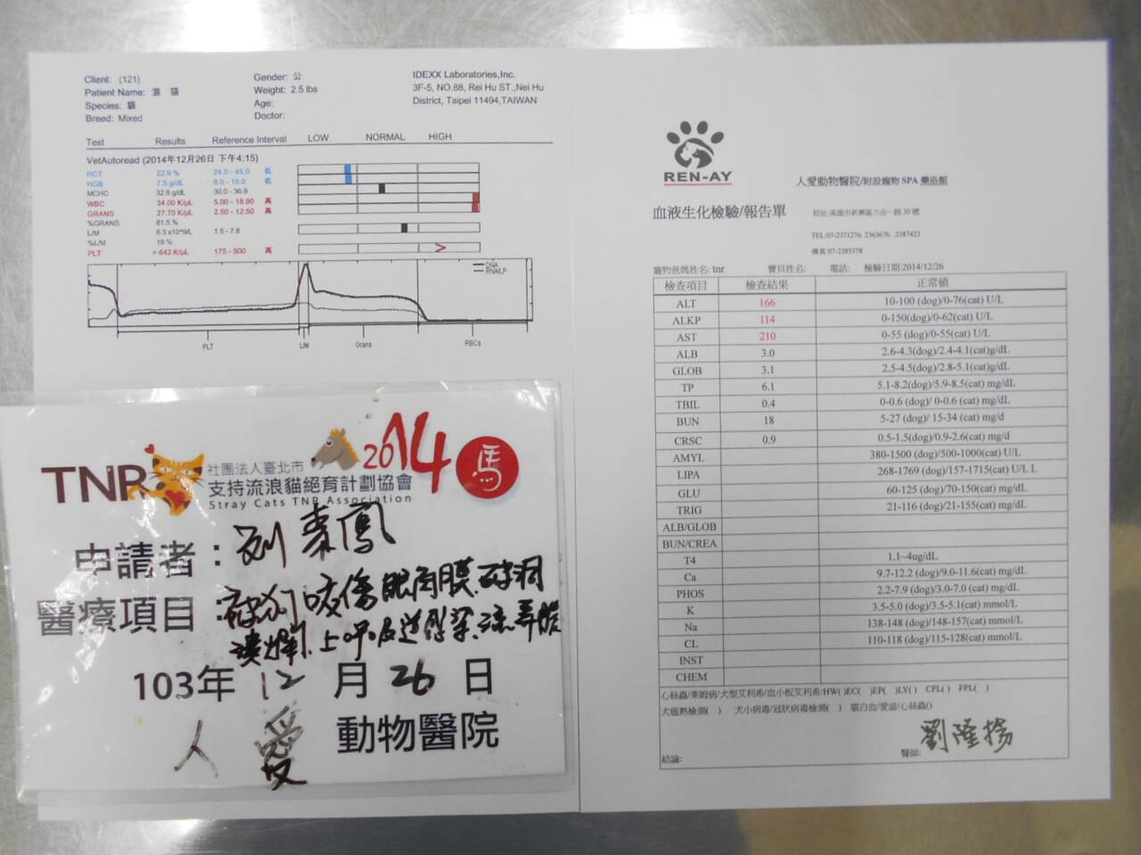 阡羅貓:CBC+生化檢驗結果:白血球相當高以達敗血症及肝腫大,肝腫大之原因可能是與浪狗打架造成之內傷