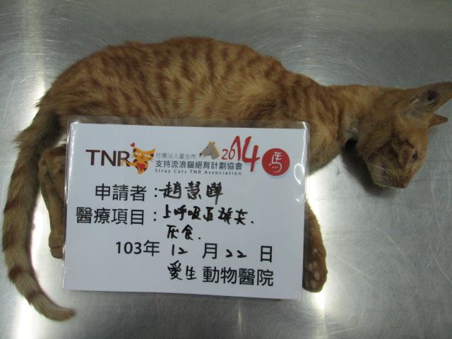主題: 嚴重感冒7天沒進食的可憐小貓 申請者姓名: 趙慧曄 花色: 申請日期: 2015-01-08 15:45:29 申請者部落格: 申請者臉書網址: 所在縣市/合作醫院: 屏東縣/愛生動物醫院 治療費用: 4700元 需求人數: 6人 已結案 (2015-02-24 11:47:29) 報名人員: April Tsung(已付款)、Q毛媽(已付款)、張雅筑(已付款)、Jessica Chen(已付款)、Stacey Ma(已付款)、Carey(已付款)、 候補人員: 動物病情說明: 這是屏東高樹鄉自助餐附近的小貓!!平時有愛媽固定餵養~餵養人說這隻小貓已有七天未出來覓食!!趕緊尋找~~不遠處已經神狀態不佳~~怕撐不下去趕緊誘捕送醫~~但小貓很兇~~經過一番誘捕終於入籠!!立刻送特約醫院醫療!!經醫生檢查醫療是嚴重呼吸道感染!!要住院點滴治療!!希望大家能幫幫他的醫療費用!!能讓他恢復健康快樂生活!!謝謝~~ 動物近況說明: 已經醫療痊癒!!健健康康的原放原生地~~吃著協會寄來的飼料罐頭!!真感謝大家的愛心!!感謝協會的幫助!!能讓他健康快樂的生活!!謝謝~~