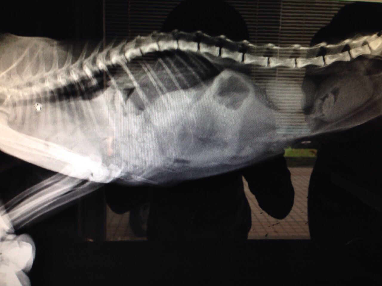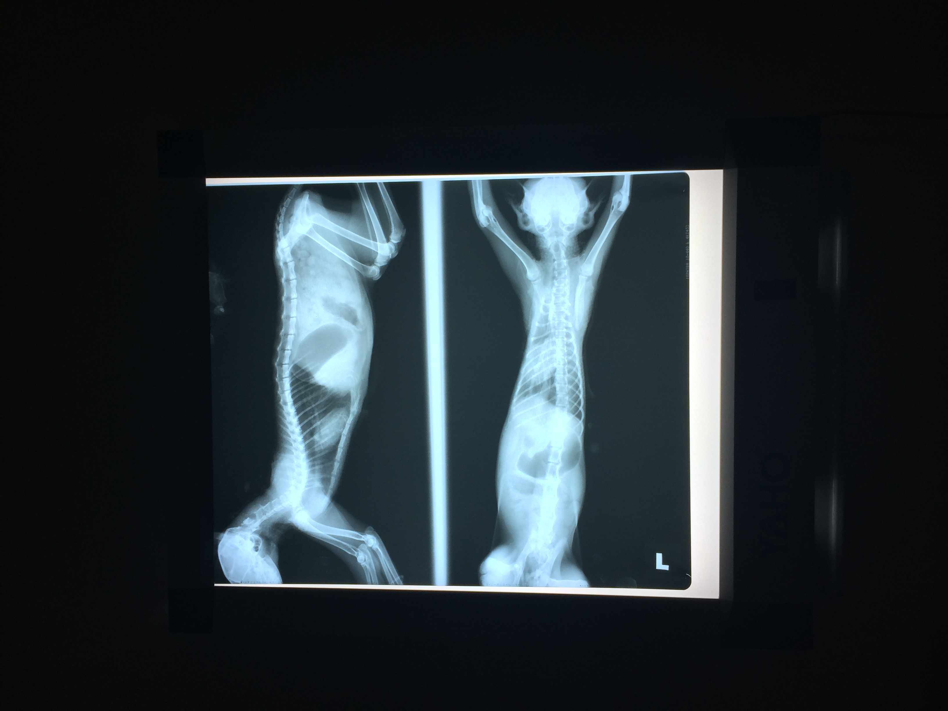 這次回去他狀況很差,肚子凹陷,食慾不佳,呼吸大又急促,想說檢查一下好送養,以為他只是營養不良,結果是胸腔赫尼亞,腸子佔胸腔1/2,呼吸窘迫,精神食慾不佳,貧血很嚴重,動手術才有存活機會。