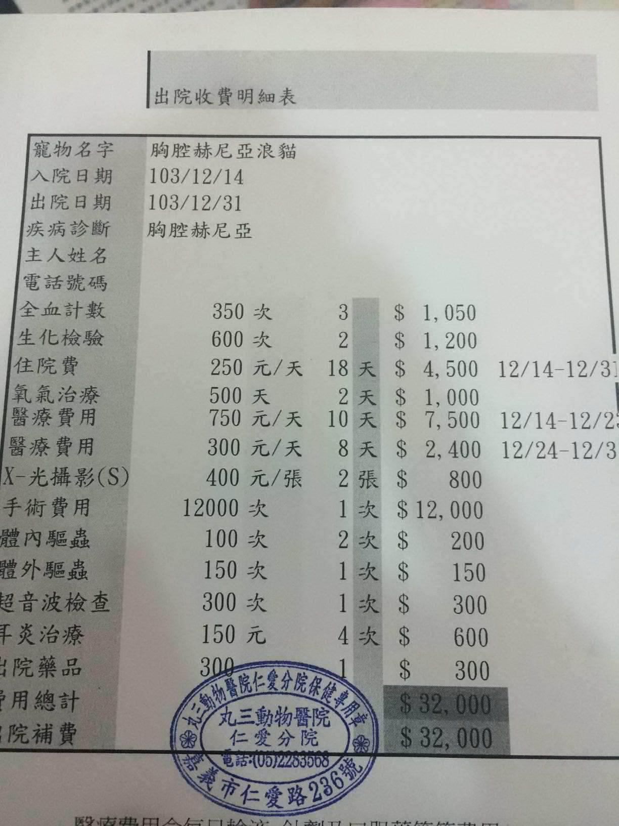 主題: 嘉義 橫隔膜破裂小貓 申請者姓名: 曾琬喬 花色: 申請日期: 2015-01-08 17:38:43 申請者部落格: 申請者臉書網址: 所在縣市/合作醫院: 嘉義市/你我牠動物醫院 治療費用: 32000元 需求人數: 35人 已結案 (2015-02-24 11:46:29) 報名人員: Katechun(已付款)、Ou Han x2(已付款)、mandy(已付款)、高永顗、陳昱先(已付款)、Wu Joanne(已付款)、sbjenny(已付款)、madbucky(已付款)、Luka(已付款)、bubudodo(已付款)、小奧(已付款)、Giselle Qiu(已付款)、Ryoka OH(已付款)、Elaine Lin(已付款)、林欣蓉(已付款)、Eli Hsiao x4(已付款)、Ago Walker(已付款)、ERic YU(已付款)、ztsai(已付款)、林琦(已付款)、Jessica、Jasmine Lin(已付款)、SU、朱莉嘉(已付款)、SU、SU(已付款)、ONE(已付款)、Jessica(已付款)、Amy Yang、lavinia x2(已付款)、Emma Kau(已付款)、小花米米點點(已付款)、Jack Wei x2(已付款)、以四面佛名義迴向給小花(已付款)、 候補人員: 動物病情說明: 西門街很多街貓,我跟外婆都會餵食,環境我們有整理,能抓的都有剪耳,我送養了4隻(都有醫護過),自己養下三隻。
