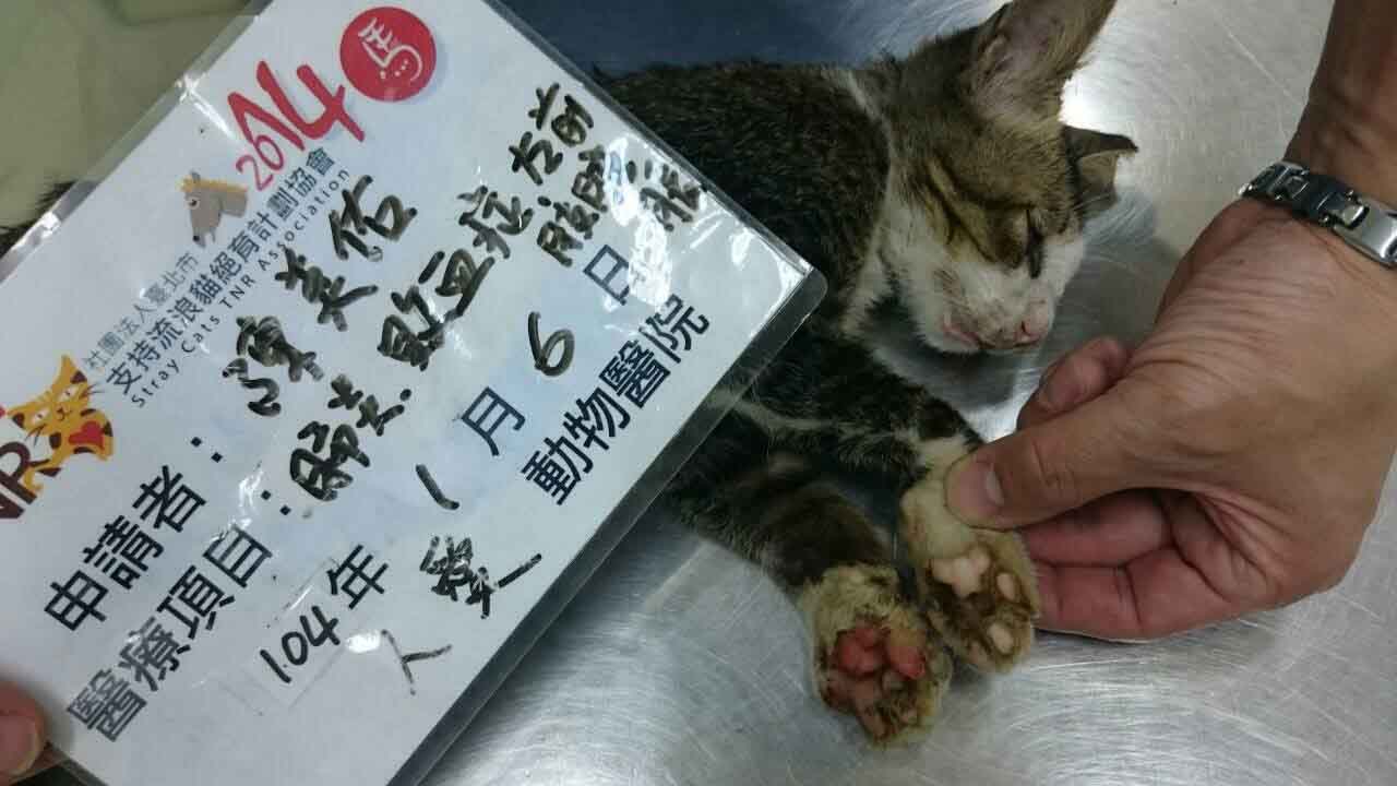 治療後,後2隻腳已消腫,前2隻腳掌腫脹也有消一點了,但前肢都因腫脹破皮無毛了~