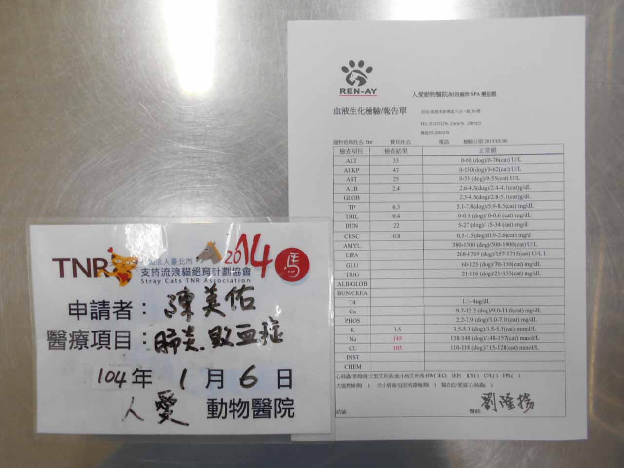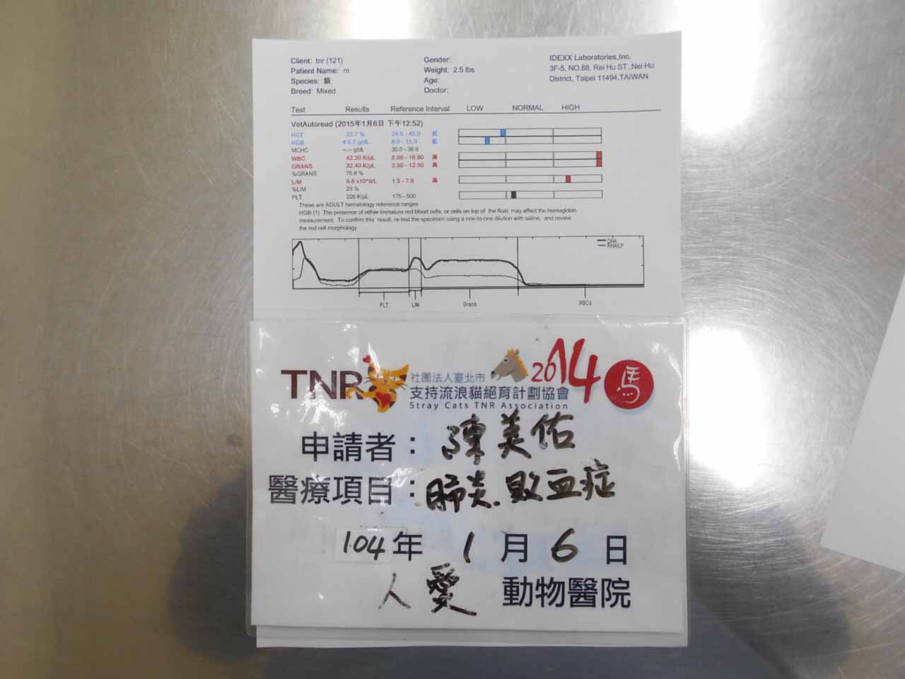 主題: 敗血症及肺炎.前腳腳掌腫脹蜂窩性組織炎. 申請者姓名: 陳美佑 花色: 申請日期: 2015-01-20 23:40:01 申請者部落格: 申請者臉書網址: 所在縣市/合作醫院: 高雄市/人愛動物醫院 治療費用: 8560元 需求人數: 10人 已結案 (2015-02-24 11:45:37) 報名人員: 林小豬(已付款)、Candyfloss Hi(已付款)、mandy lin(已付款)、Kristy Lee(已付款)、Jasmine Lin(已付款)、林西吉(已付款)、劉小樺(已付款)、Shanti(已付款)、Wei-Ling Liang、winnie liang、lavinia x2(已付款)、 候補人員: 動物病情說明: 在餵養區的這隻貓觀察已咳嗽、打噴涕將近一週,