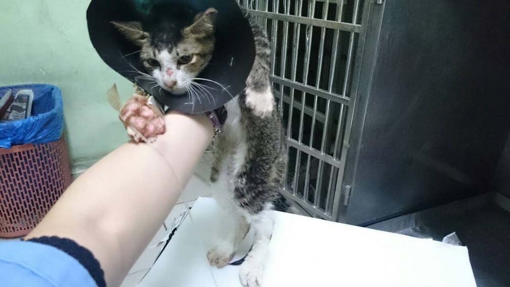我叫牠有稍微抬頭看我,但不會喵叫,非常虛弱消瘦,站不太穩~