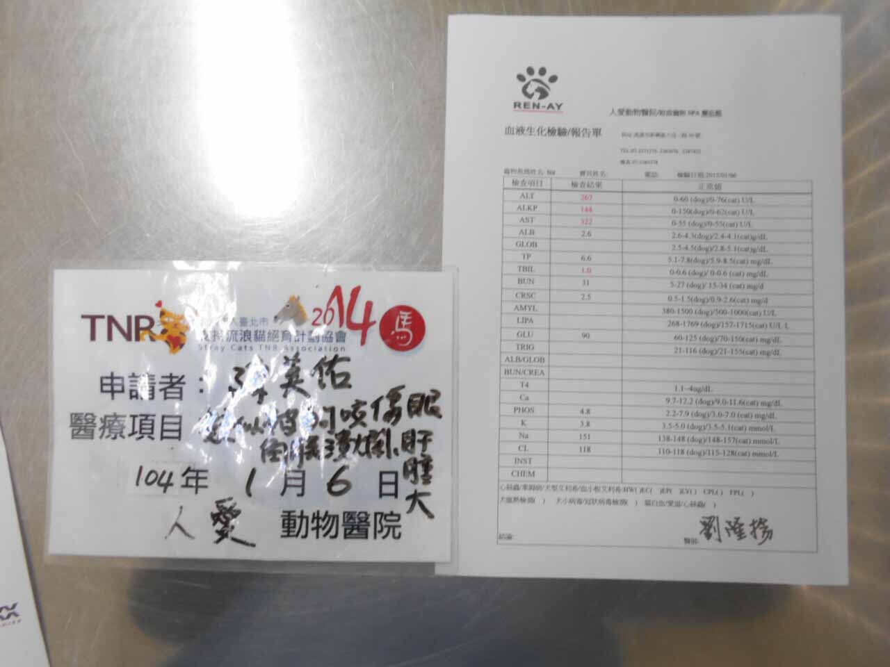 主題: 疑似被狗抓傷眼睛.眼角膜潰爛致失明,肝腫大. 申請者姓名: 陳美佑 花色: 申請日期: 2015-01-24 20:21:59 申請者部落格: 申請者臉書網址: 所在縣市/合作醫院: 高雄市/人愛動物醫院 治療費用: 6615元 需求人數: 8人 已結案 (2015-02-24 13:09:12) 報名人員: SeiJi Lin(已付款)、Becca Huang(已付款)、Fan(已付款)、banban(已付款)、林西吉(已付款)、Patrick x3(已付款)、 候補人員: 動物病情說明: 在餵養區發現這隻貓疑似被狗抓傷眼睛.眼角膜潰爛.