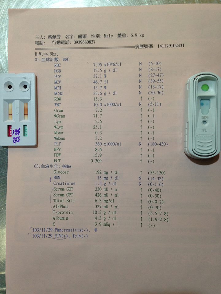 一早送醫後血檢發現,饅頭驗出有貓愛滋(泣)還有黃疸,牙齦滲血,肝指數飆高,膽管肝炎,血巴東蟲,還好腎指數還在正常質中,和醫生討論後,上點滴給予藥物治療,住院時間初估是二星期,但會視貓咪狀況調整,也希望他在治療中狀況變好,就不用住在醫院那麼久.
