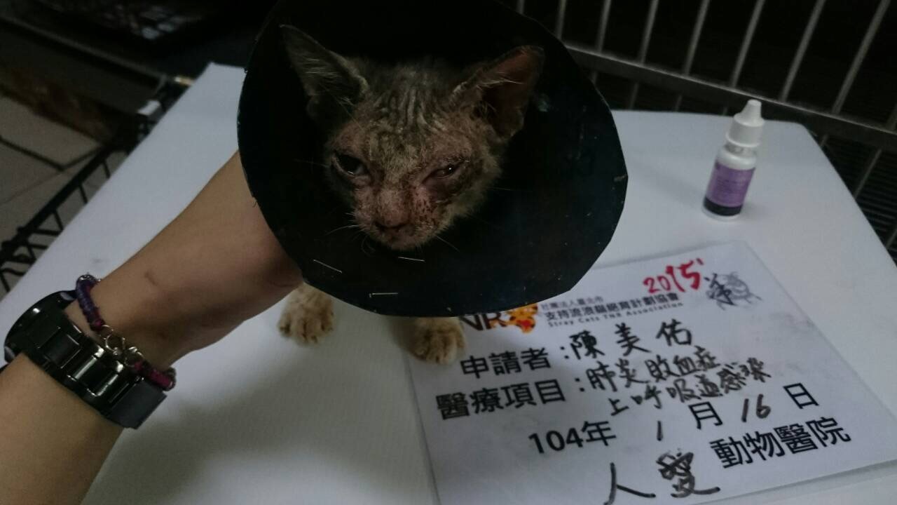 主題: 跨年夜發現的肺炎小貓 申請者姓名: 陳美佑 花色: 申請日期: 2015-01-22 00:16:06 申請者部落格: 申請者臉書網址: 所在縣市/合作醫院: 高雄市/人愛動物醫院 治療費用: 7380元 需求人數: 9人 已結案 (2015-02-24 12:34:33) 報名人員: 王嗣皓(已付款)、Shan Shi Lai(已付款)、丁羽楹(已付款)、以四面佛名義迴向給小花(已付款)、酥餅 x2(已付款)、grace0710 x2(已付款)、Ginelle Qiu(已付款)、 候補人員: Shiqin Huang、楊宜臻、 動物病情說明: 跨年夜回家路上發現此貓精神沉鬱~流鼻涕~打噴嚏~全身皮膚病且體溫非常熱~帶回家又發現此貓完全沒食慾~今天趕緊送醫~經醫生聽診發現胸部柔音~懷疑此貓已罹患肺炎~精神不濟~恐有生命危險~建議須抽血檢驗及住院皮下點滴治療.