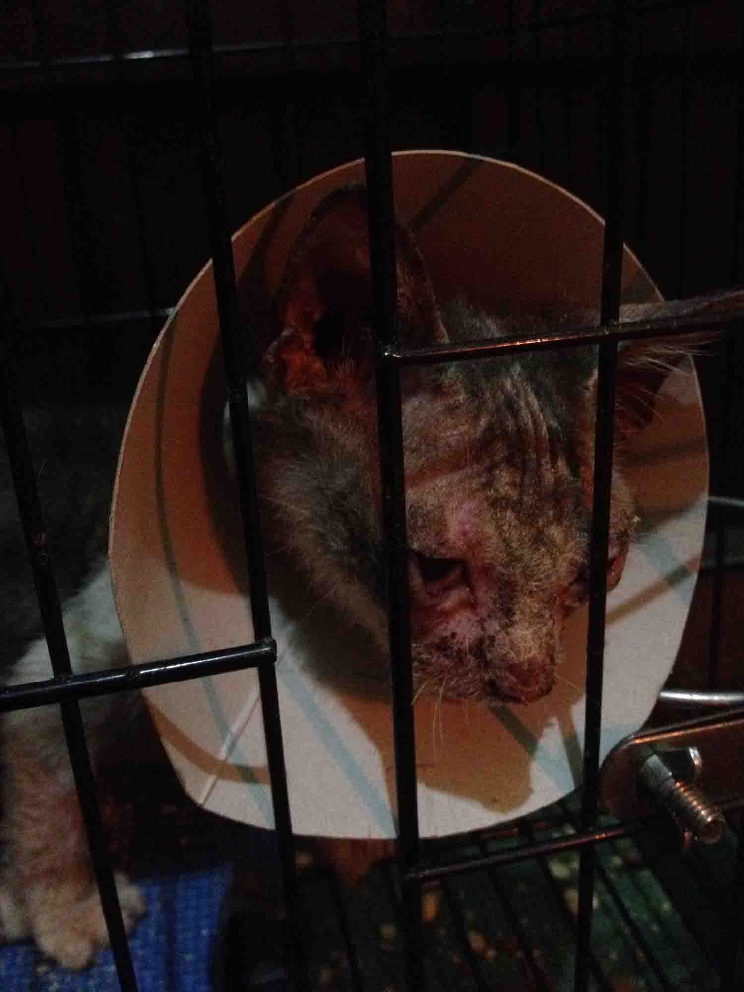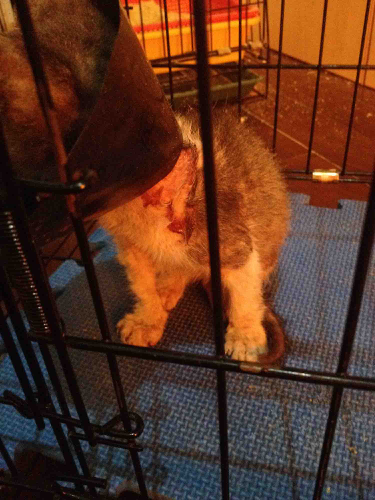 接回當天,路程中,因頭套磨擦皮膚,已更換紙板頭套避免再傷皮膚.