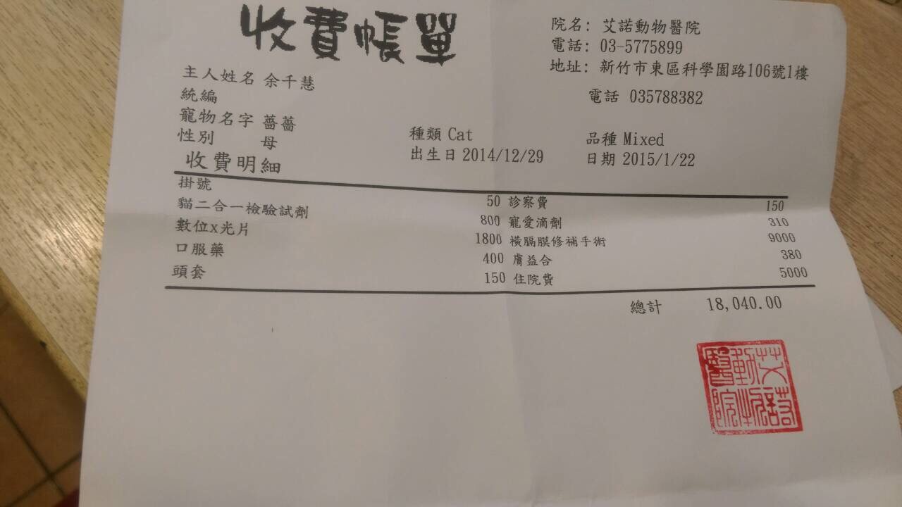 主題: 橫隔膜破裂 申請者姓名: 詹鎵榕 花色: 申請日期: 2015-01-22 11:32:30 申請者部落格: 申請者臉書網址: 所在縣市/合作醫院: 新竹市/艾諾動物醫院 治療費用: 18040元 需求人數: 19人 已結案 (2015-04-14 17:27:57) 報名人員: Kitty Bear(已付款)、Shane(已付款)、MatteaWu(已付款)、Ching-Ya Peng(已付款)、Coco Chuang、典媽 x3(已付款)、Fan(已付款)、小朱(已付款)、柯小貓(已付款)、孟星魂(已付款)、林西吉(已付款)、林小儀(已付款)、Patrick(已付款)、su(已付款)、Linus(已付款)、Wanhua Chan(已付款)、張禾空間設計工作室 x2(已付款)、 候補人員: 動物病情說明: 您好,很抱歉要麻煩您