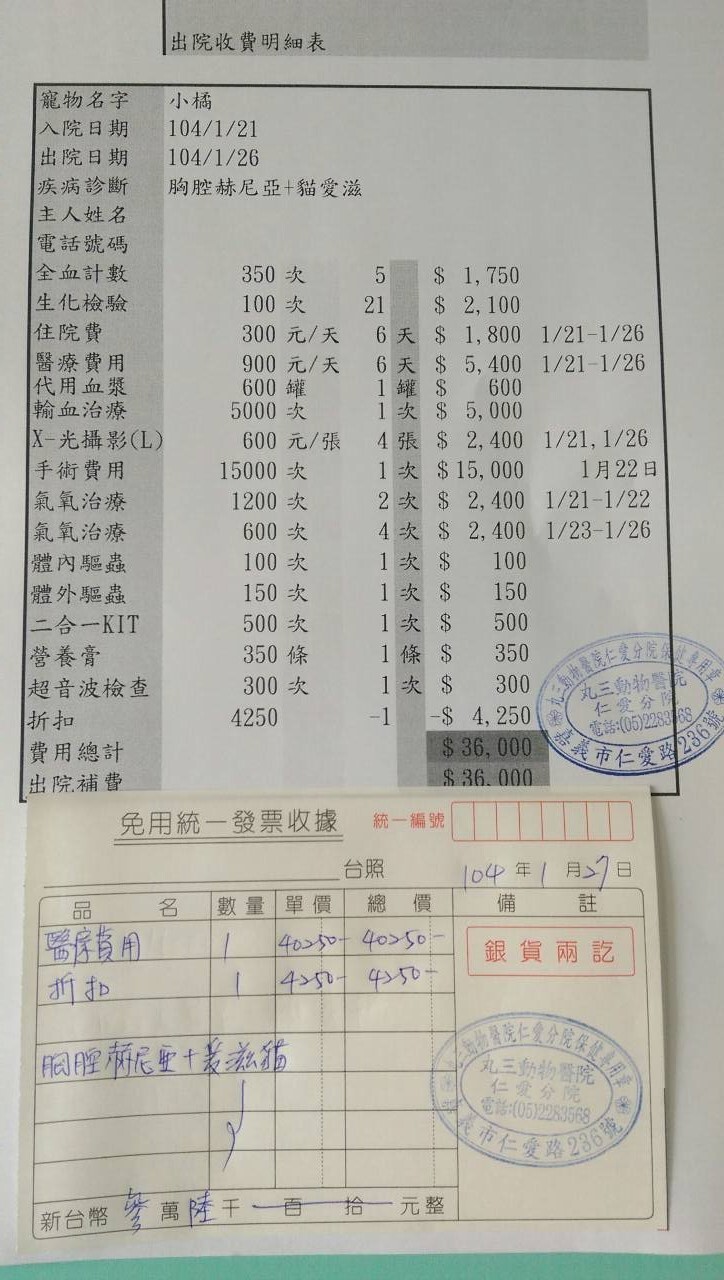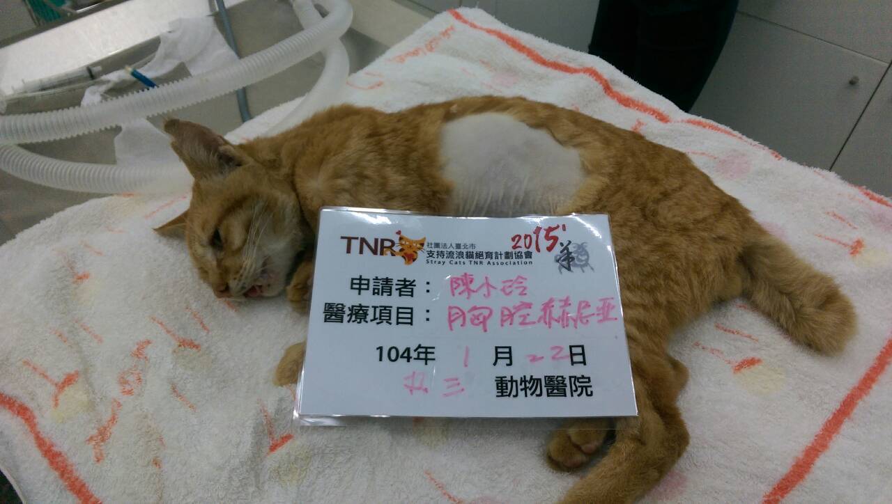 主題: 胸腔赫尼亞 申請者姓名: 陳小玲 花色: 申請日期: 2015-01-29 14:19:57 申請者部落格: 申請者臉書網址: 所在縣市/合作醫院: 嘉義市/你我牠動物醫院 治療費用: 36000元 需求人數: 39人 已結案 (2015-02-24 12:31:12) 報名人員: Portia Chen(已付款)、Ryoka Oh(已付款)、Wheat Chiang(已付款)、Ping Hussard(已付款)、Ray0322(已付款)、AmbeR Hsu(已付款)、Belinda Wang(已付款)、Chen Chris(已付款)、愛麗絲(已付款)、Bubu Wang(已付款)、Apple Chou(已付款)、Grace Lin(已付款)、mitdo43(已付款)、佩(已付款)、lavinia x3(已付款)、Josie Josie x2(已付款)、海郁(已付款)、高賽(已付款)、Tiffany Shen(已付款)、蘇小吉(已付款)、Miao Lin(已付款)、肉&菜(已付款)、dcelife(已付款)、郭瑞希、毛絨絨(已付款)、戴戴(已付款)、Cathy(已付款)、zoelo(已付款)、綺(已付款)、Yen-Yuan Wang(已付款)、May Chuang(已付款)、Candace Shiue x2(已付款)、Lewis Wong x3(已付款)、Misu Sweet(已付款)、 候補人員: 動物病情說明: 橘橘是我餵養二年半的貓,一直在我的餵養區生活,最近發現牠一直喘氣,每次吃食物時總是呼吸急促,造成腹部快速收縮,因為這二星期天氣很冷,我以為牠感冒了,包了二次藥回來投藥,1/6一次,1/14一次,但好像沒改善,沒想到今天看到牠竟然一直喘,我回家拿了提籠和誘捕籠,先放了提籠後,牠竟然乖乖的走進提籠了,我想牠一定生病了,趕緊送去醫院。