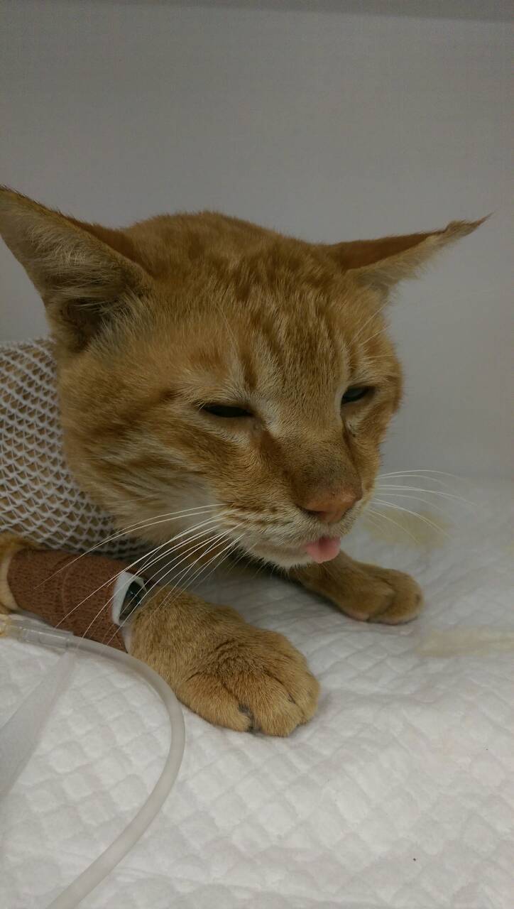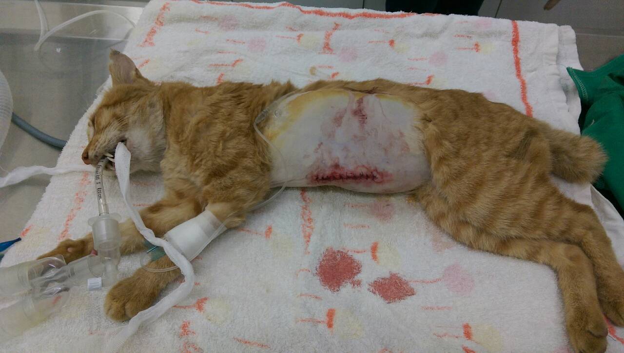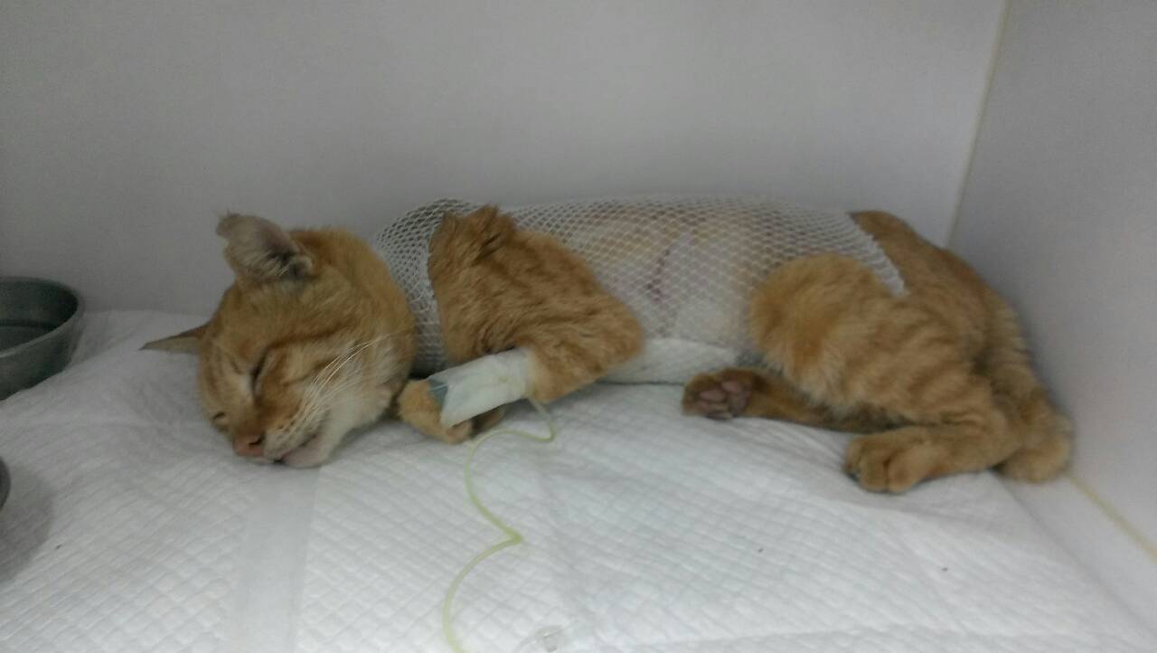 醫生說牠的呼吸不正常,應該被撞到了,而且有一段時間了,要照X光看看,結果一照完竟然是,肝,腸跑到胸腔去了,才會造成呼吸窘迫,難怪牠每次吃飯都一邊吃一邊呼吸困難,所以要趕緊開刀,我擔心牠的肝腸不知道會不會壞死,希望能趕快得到協會的幫助。動物近況說明: 1/21抓到橘橘,檢查出來是胸腔赫尼亞,1/22馬上開刀,因為整個腹腔的器官都擠到胸腔去了。