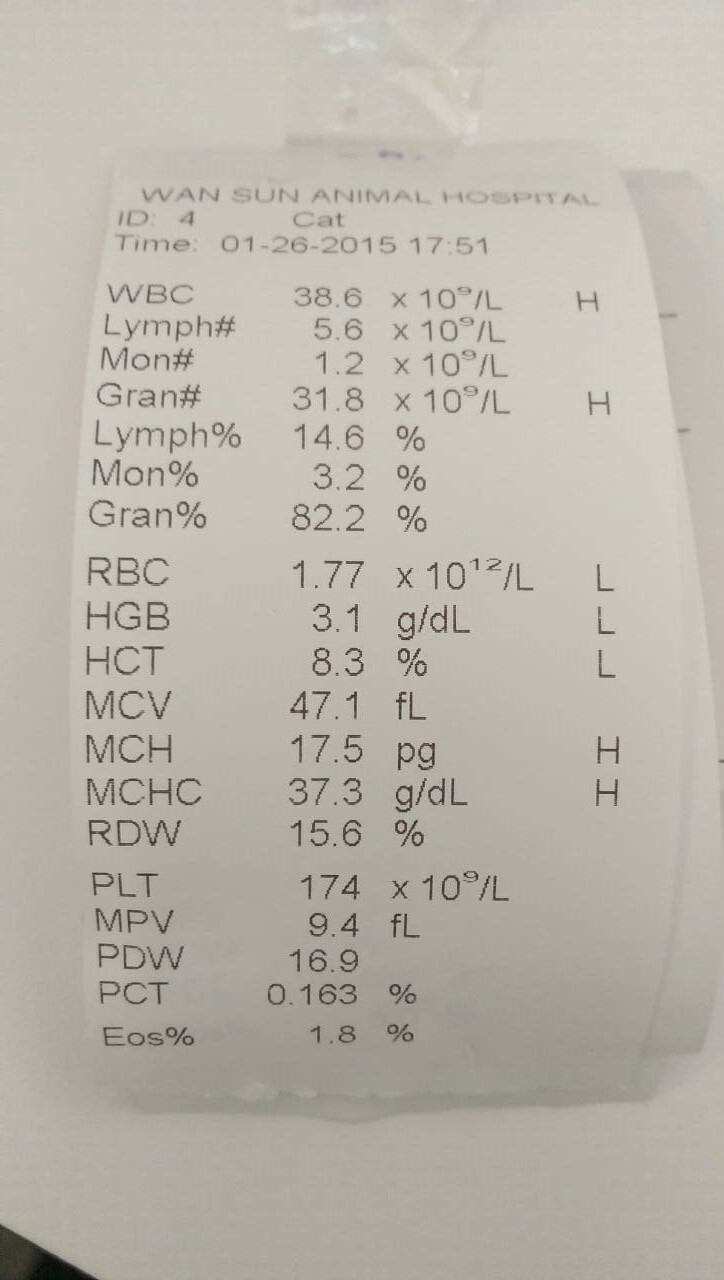 1/26一早去看你,你的狀況已經不是很理想,醫生說你的血紅素一直往下掉,所以要找可以捐血的貓,因為來的急又快,我馬上找了朋友和我的貓去配對,其中一隻配對成功就趕快輸血,晚上我還是一直擔心著,1/27凌晨1:30醫生說你的血色有起來了,我才去睡,整晚的翻來覆去的等待天亮,醫院一開門就衝去看你,但在病床上沒看見你,我知道你走了,阿姨真是後悔沒有早點抓你,不然你也不會走了,希望你當快樂的小天使,別再流浪了,我的浪孩,