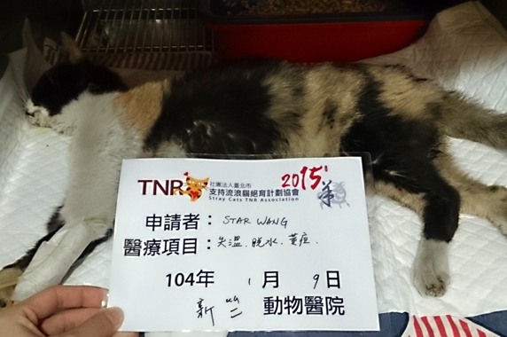 主題: 南寮收容所昏倒花兒 申請者姓名: Star Wang 花色: 申請日期: 2015-02-03 23:01:27 申請者部落格: 申請者臉書網址: 所在縣市/合作醫院: 新竹市/新竺動物醫院 治療費用: 22000元 需求人數: 25人 已結案 (2015-02-24 12:30:50) 報名人員: Amber Chung(已付款)、alicelin x2(已付款)、hakumaio(已付款)、典媽 x5(已付款)、鍾怡君(已付款)、Mimi Liu(已付款)、ONE(已付款)、zining(已付款)、ERic YU(已付款)、Yixiun x2(已付款)、Even Chen(已付款)、Amo Wang x2(已付款)、Rebecca Lu x2(已付款)、Coffeemilk(已付款)、yvonne(已付款)、伍伍迪(已付款)、林東震(已付款)、 候補人員: 動物病情說明: 20150109南寮收容所的昏倒三花,