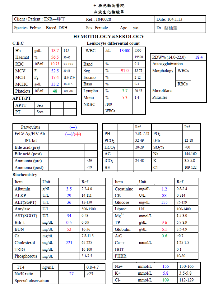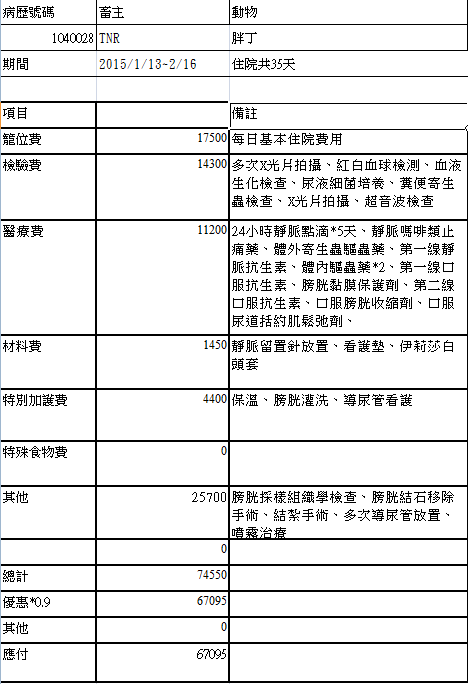 主題: 宜蘭血尿街貓 申請者姓名: 潘瑄佩 花色: 申請日期: 2015-03-18 10:32:29 申請者部落格: 申請者臉書網址: 所在縣市/合作醫院: 台北市/極光動物醫院 治療費用: 67095元 需求人數: 70人 已結案 (2015-04-14 17:19:43) 報名人員: 俋思國際有限公司(已付款)、Chun-Ling Chen(已付款)、翁名孜、Sarah Chang x2(已付款)、Anna Hong(已付款)、chiaowho x3、施婉菁(已付款)、Bella Chen(已付款)、Daniel Tsai(已付款)、黃小語 x2(已付款)、Ling Li x2、Ling Li x2、Ping Hussard(已付款)、Yi-hsuan Liu(已付款)、madbucky(已付款)、豆腐人(已付款)、Po-Lin Chen x2(已付款)、櫻花妹(已付款)、00(已付款)、王大咪(已付款)、煌邵(已付款)、李米、Catbask(已付款)、陳昱先(已付款)、桔比(已付款)、Jiing、Jiing(已付款)、麻薯熊(已付款)、miraai(已付款)、Roxy Hu、Roxy Hu、ivie(已付款)、蕭泰咪(已付款)、Cynthia Pan x2(已付款)、Patrick x10、Cynthia Pan x2(已付款)、Cynthia Pan x2(已付款)、王千枝 x2(已付款)、Carry Chen(已付款)、Yen-Ling Lai(已付款)、Luis(已付款)、Prince Chen(已付款)、Tiffany Cheung x5(已付款)、Tiffany Cheung x6(已付款)、Nans(已付款)、Ling(已付款)、sally x2(已付款)、vivian(已付款)、Vivian Chen(已付款)、cc-ninomi(已付款)、Zheng(已付款)、Chien Ping Chuang(已付款)、fang7880(已付款)、陳珍妮(已付款)、mint(已付款)、Margaret Chang x2(已付款)、有貓真好 x2(已付款)、有貓真好 x2(已付款)、Janice(已付款)、 候補人員: 動物病情說明: 原本是住家附近的流浪街貓(有鄰居會在自家門口放置飼料餵養),在今年1月份寒流時發現被狗攻擊追咬,長時間持續漏血尿,誘補時應該已是非常虛弱,所以不太反抗。經初步檢查發現尾巴神經已受損,貓咪行走時是拖著尾巴的,另外膀胱功能受傷嚴重,估計是過去長時間發炎導致膀胱內壁增厚,並持續有血尿情況,同時也發現膀胱內有結石,FIV檢驗為陽性。雖然初到院時是一隻兇貓,但經過一些初步醫療後,或許是身體不再那麼不適,性情轉變為非常親人(會主動磨蹭撒嬌),因此雖然病情及預後並不那麼樂觀,但還是優先排除安樂死的選項,極光的醫師們都沒有放棄,盡力為胖丁醫療,而胖丁自己也很堅強,配合每一次的導尿置入及檢查,胖丁龐大的醫療費用需要大家一起幫忙。 動物近況說明: 胖丁已從醫院先接回通報人家中照顧,目前仍裝有導尿管進行強制排尿,待觀察期後需回醫院確認膀胱功能是否可以自行排尿,若不行則終生需裝導尿管生活,且需固定回診追蹤。日常飲食需使用處方飼料及Cystaid,並每日確認尿液(顏色/量)變化。