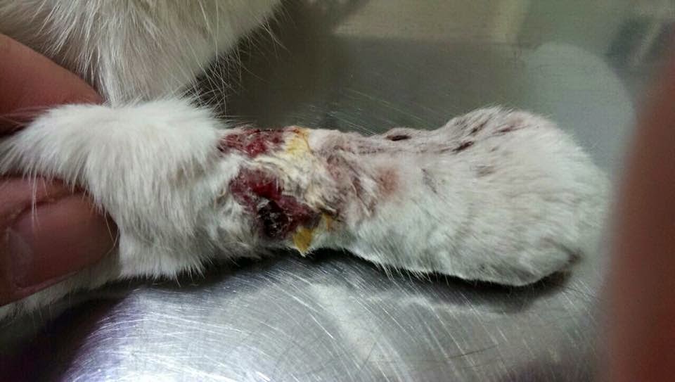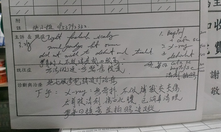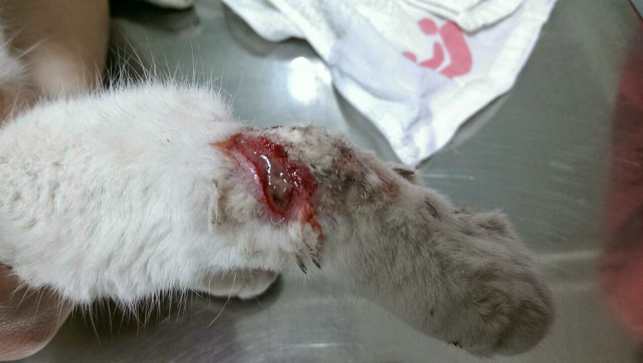 貓咪送至汐止新北動物醫院,下午與郭醫生聯繫,醫生為了避免貓咪骨頭如果有受傷,檢查時的掙扎會加重傷勢,所以建議先注射鎮定劑再做X光檢查。所幸檢查結果貓咪的骨頭是沒有受傷的,但是皮肉部分已經發炎流膿,貓咪因此注射抗生素並且留院每天清創傷口。