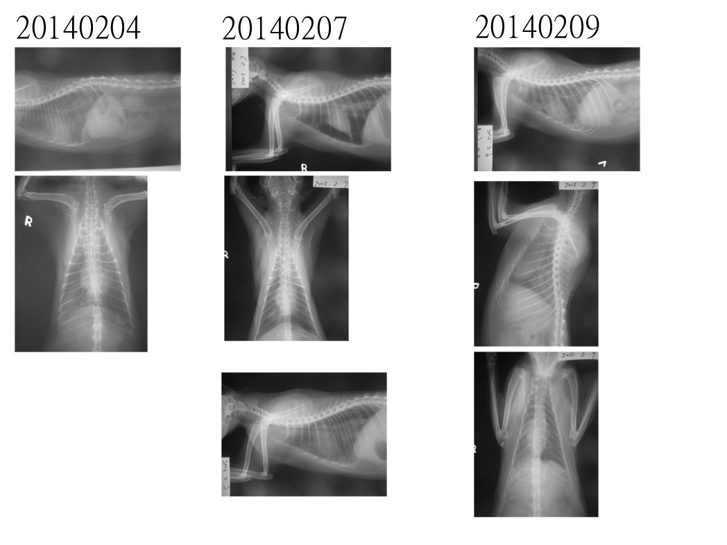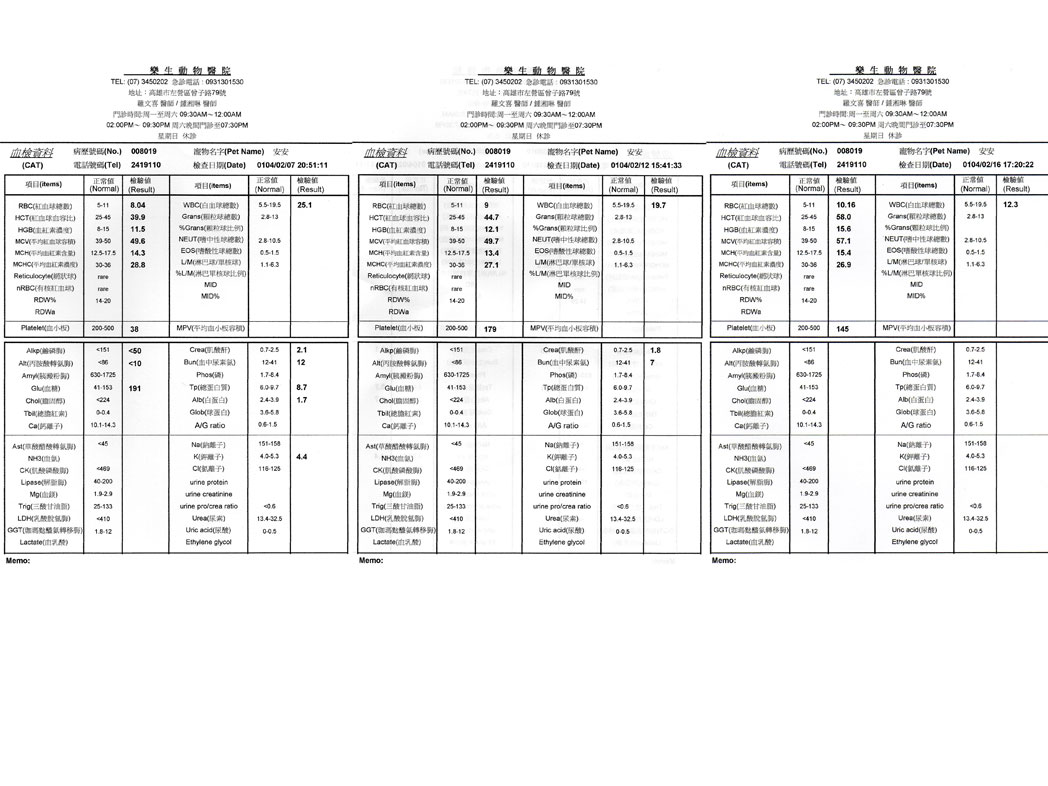 經過檢查發現安安背部有外傷且有脫水,呼吸急促及肺水腫的跡象,血檢有白血球及ALKP過高的現象且白血球有核左轉,初步診斷為肺炎但不排除傳染病及心臟的問題,目前先點滴及氣霧治療後再拍X光片看是否有改善