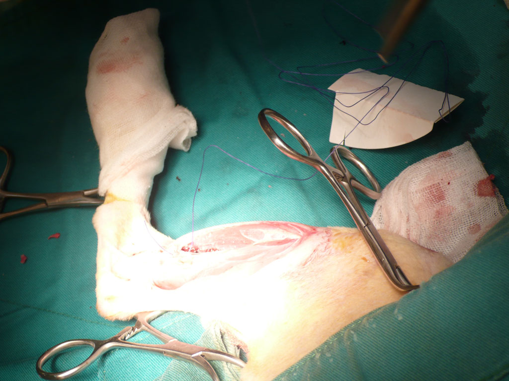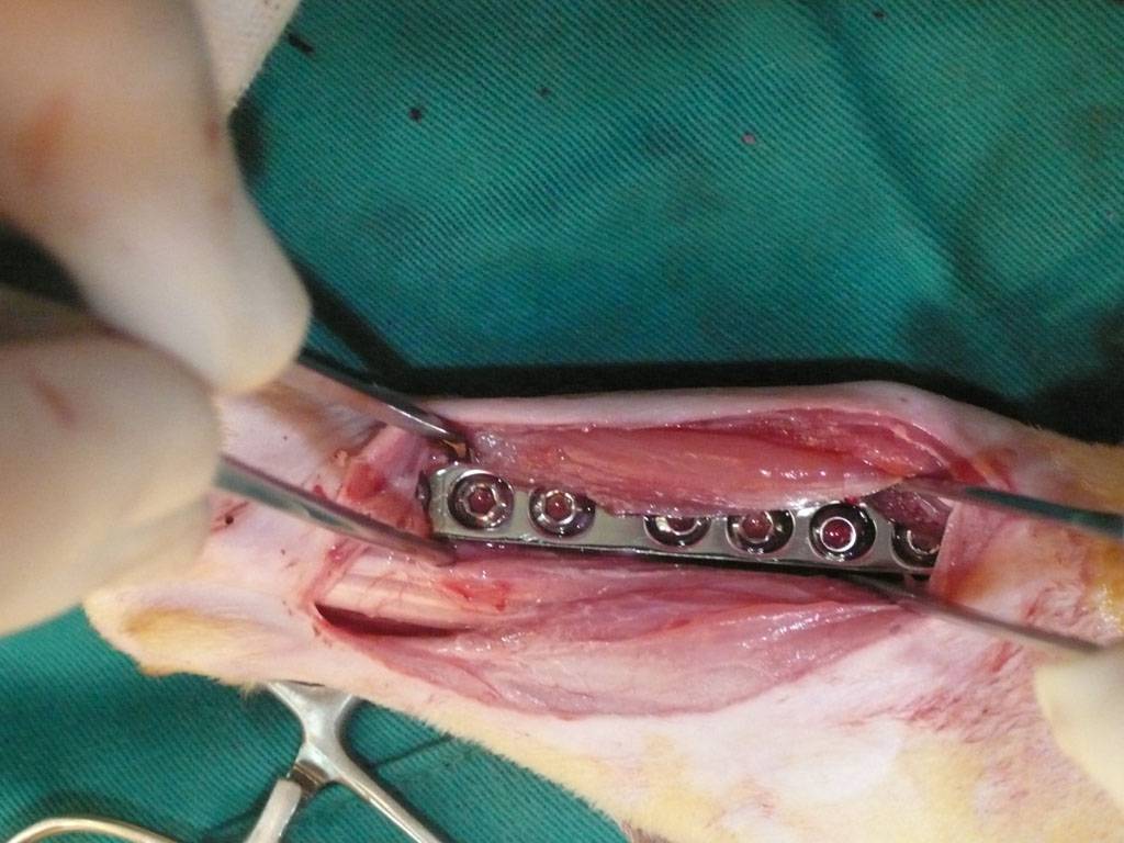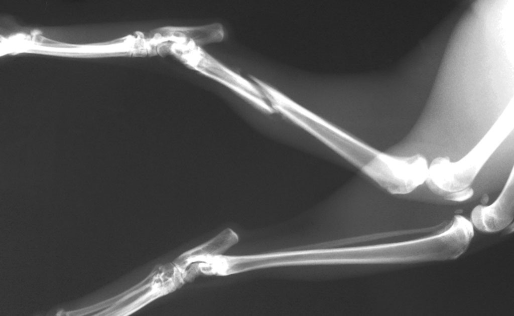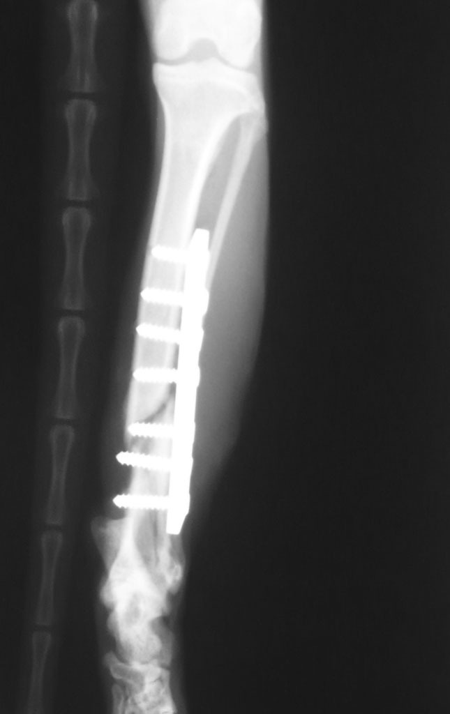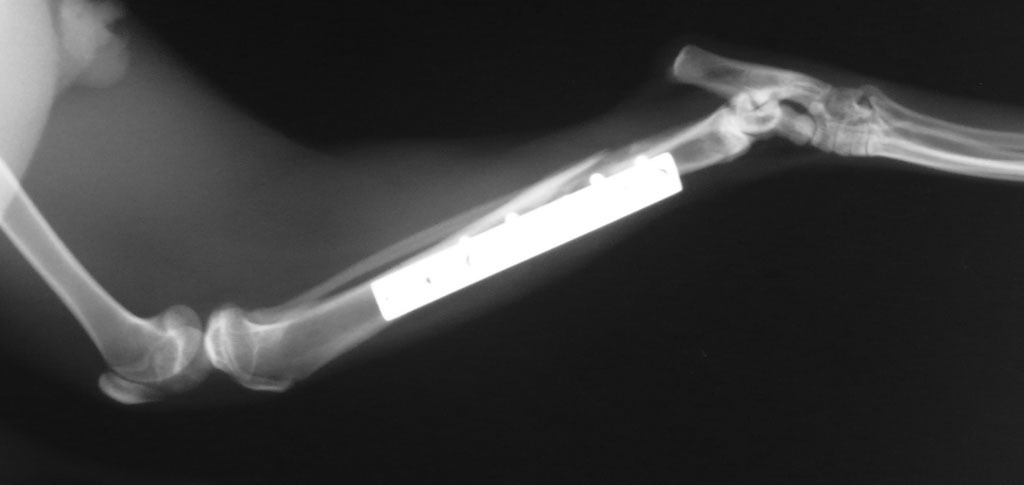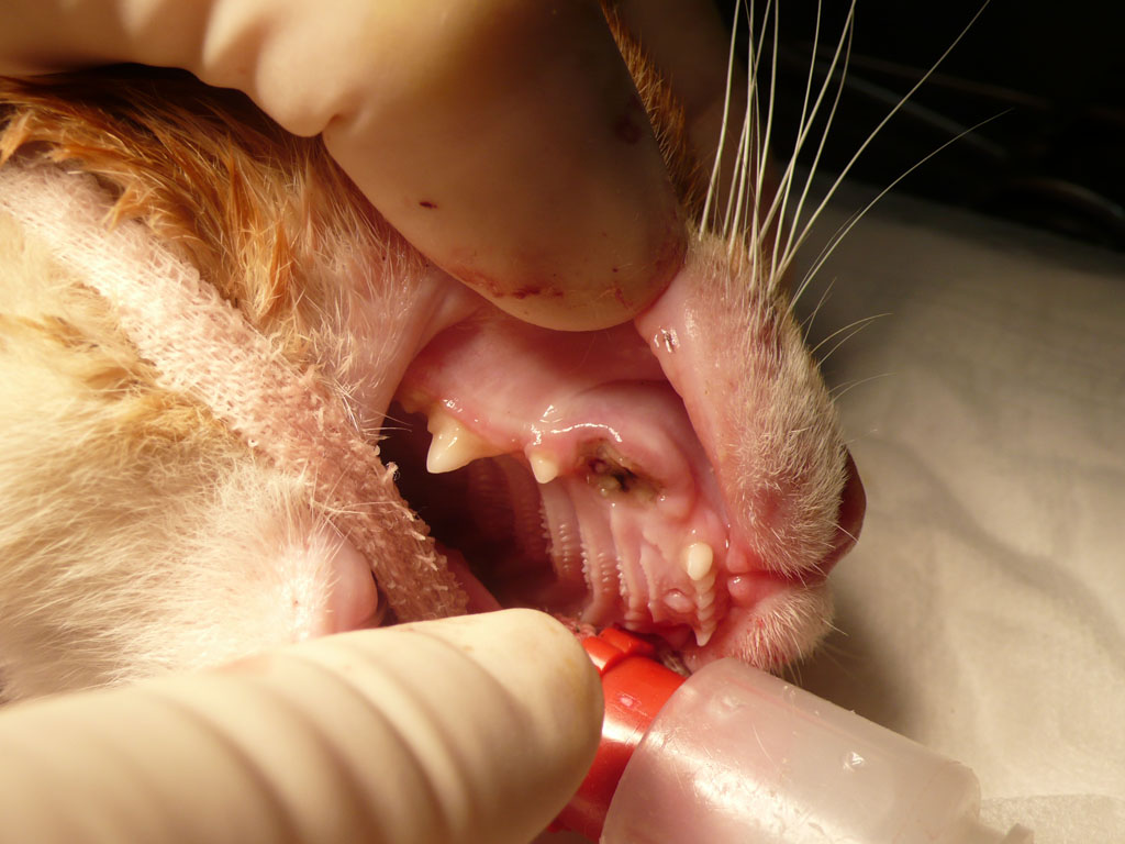 過兩天,抓到牠了,送到長沁醫院。麻醉完,張醫師打開牠的嘴一看,四顆犬齒全爛了,犬齒旁還有一個婁管(一個大洞),氣味非常不好聞,可見裡面已經嚴重發炎了,張醫師說,如果沒有及時處理,未來有可能會敗血症而死亡。之後照了x光,發現牠的後腿骨折了,需要馬上動手術處理。當天,晚上八點多我去醫院看牠,張醫師還在縫合傷口,手術時間頗長。