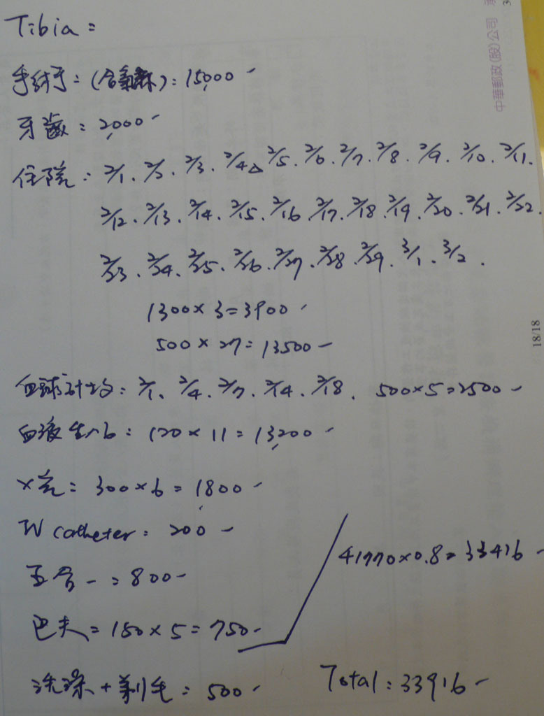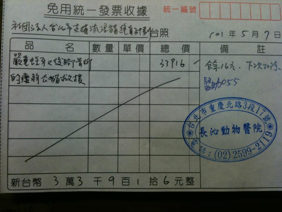 醫療及住院費用共41770元(這部分打8折為33416元),加上洗澡剃毛費用500元,合計共33916元,待醫院收到醫療費用會開正式收據給協會。
