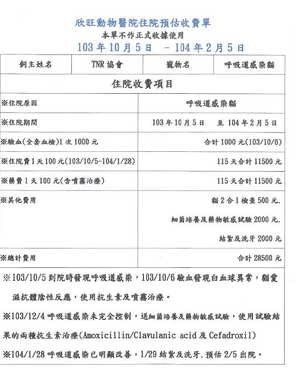 主題: 中和地區嚴重鼻氣管炎的摺耳流浪貓 申請者姓名: 臺北市支持流浪貓絕育計劃協會 花色: 申請日期: 2015-02-10 18:03:00 申請者部落格: 申請者臉書網址: 所在縣市/合作醫院: 台北市/欣旺動物醫院 治療費用: 28500元 需求人數: 31人 已結案 (2015-02-24 11:41:43) 報名人員: stacey lin(已付款)、Sherry(已付款)、Peter Chen(已付款)、夜魚子(已付款)、Iris Chen(已付款)、Roxy Hu(已付款)、白白媽(已付款)、Jenny(已付款)、Kyra Chu(已付款)、Jason Chang、紅色柚子(已付款)、Polly Ma x2(已付款)、Nunu(已付款)、陳小茜(已付款)、張偉翔 x2(已付款)、lalapie(已付款)、Annier(已付款)、梁咪子 x2(已付款)、Summer(已付款)、skylung(已付款)、Patrick x3(已付款)、君君(已付款)、Frankie(已付款)、FS.NG(已付款)、betty huang(已付款)、Candyfloss Hi(已付款)、Yi Ting Yang(已付款)、 候補人員: 動物病情說明: 網友通報中和地區出現波斯和摺耳流浪貓咪,皮膚狀況不好毛髮稀疏似有皮膚病,精神狀況不好開罐頭不吃,一直窩在車底下,看起來好像生病,志工前往架設誘捕籠,貓始終不願意靠近,志工趴在車底溫情喊話貓緩緩靠近,志工一把抱起塞在提籃裡,趕緊送醫,摺耳嚴重鼻氣管炎,口鼻分泌物多,前幾天精神不好,打水補充水分並給予口服抗生素,慢慢願意自己進食,但量不多,灌食會掙扎因為舌頭都潰瘍很不舒服,口服抗生素治療一個月後狀況算穩定,但只要天氣稍有變化,就開始不吃,有鼻膿、眼睛瞇瞇的,繼續噴霧治療、灌食,過幾天狀況又轉好,就這樣反反覆覆的,一直住院治療中,慢慢對抗生素的反應不好,送實驗室檢驗發現許多抗生素的對貓反應不佳,又不斷嘗試變換,終於在一月底驅於穩定,體重也大幅提升,個性也越來越撒嬌,已先帶回安養之家照顧,目前已結紮施打過ㄧ劑預防針。因住院期間較長醫療費用上醫師已經給予極大的折扣,還請各位幫忙。費用包括住院治療、血檢、結紮、洗牙。